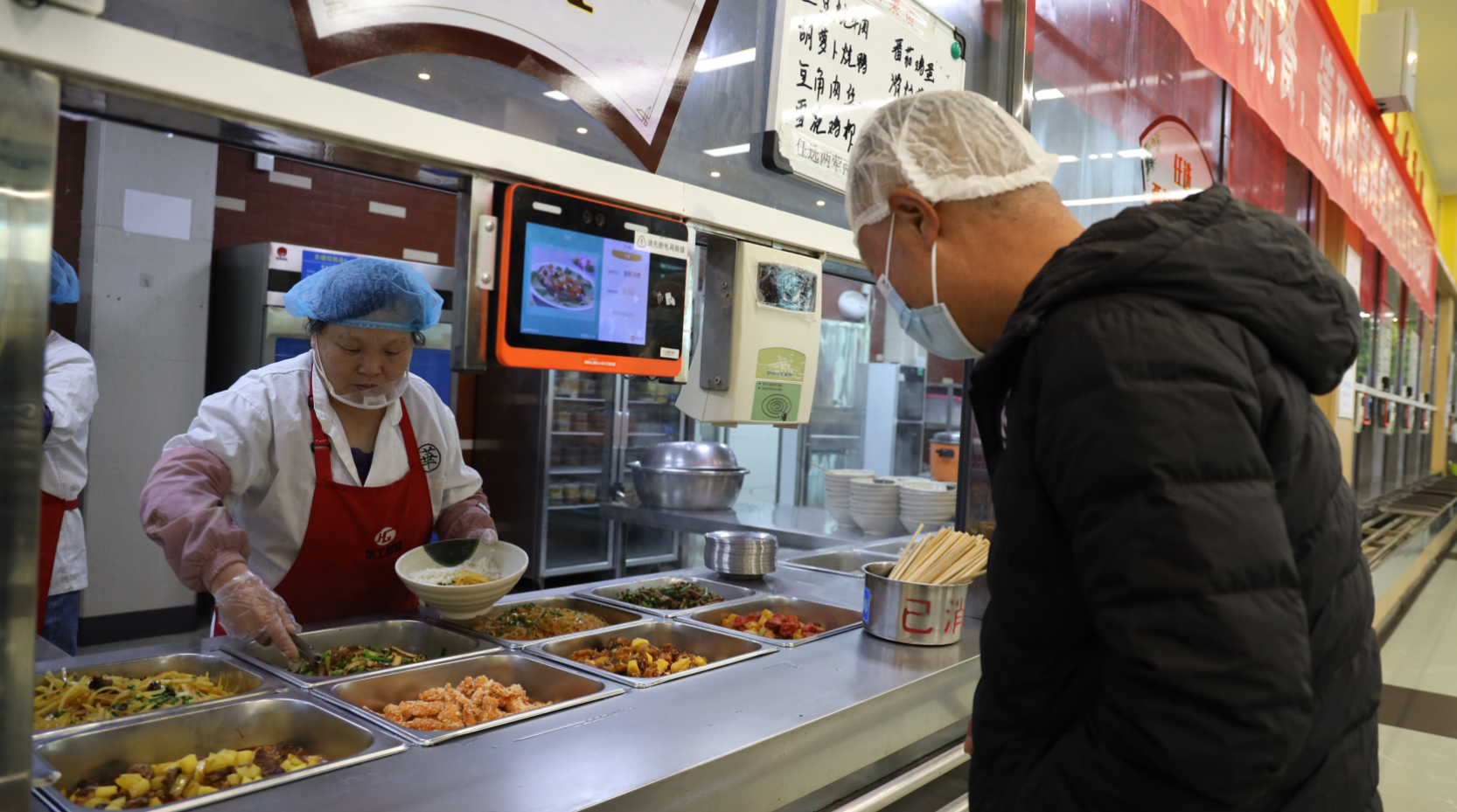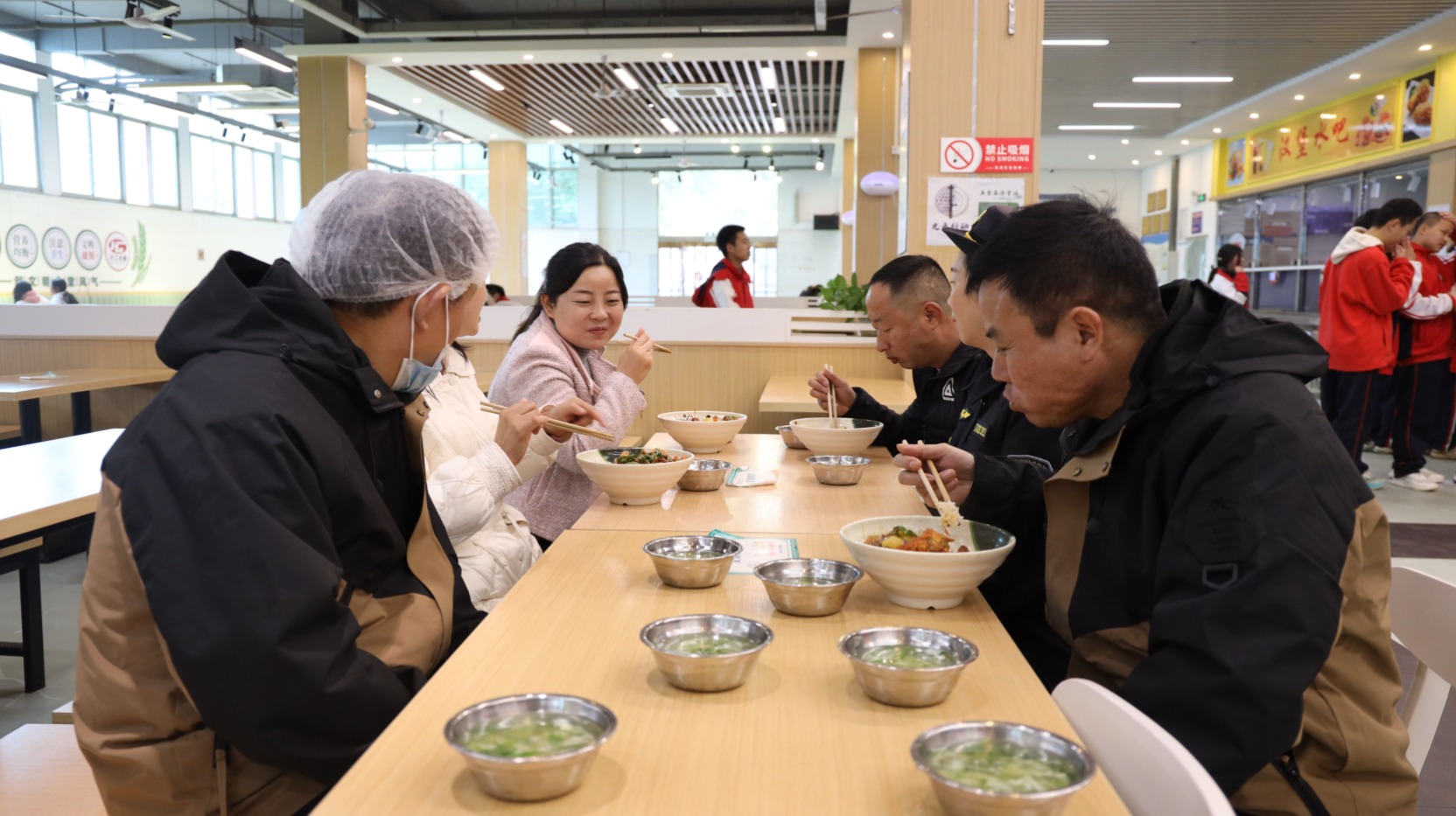 检查环节结束后,代表们移步学生餐厅,与学生们一同排队取餐,并共进午餐,对菜品的口味、色泽以及营养搭配进行了直观的感受和评价。
