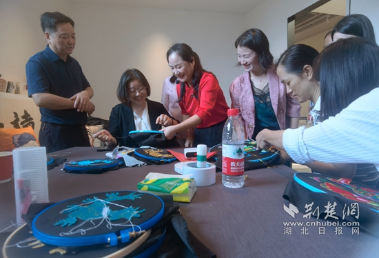 图为阳新县副县长林子荣(左2)现场学习阳新布贴制作。田城/摄