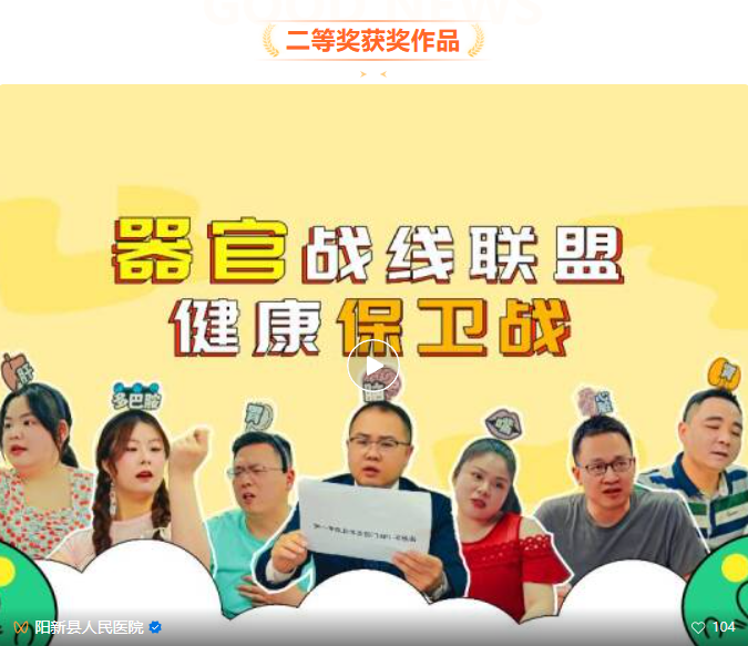 阳新县人民医院选送的多部优秀作品,从百余部作品脱颖而出,揽获多项荣誉,《请get你的“艾”情通关秘籍》荣获视频类一等奖,《器官战线联盟:健康保卫战》获得视频类二等奖,王志远、石淑珍报送的图文类作品《基孔肯雅热:被蚊虫叮咬引发的“折叠之痛”》获得三等奖。