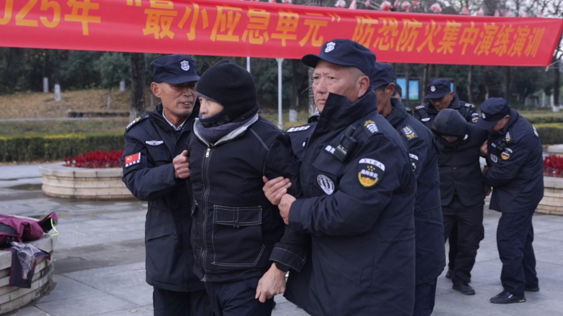 演练设置反恐防暴与消防处置两大科目:反恐环节模拟“暴恐分子”持械冲闯校园入口,学校门岗单元迅速报警、疏散群众,利用盾牌钢叉合围控制“暴恐分子”并规范移交模拟警方;消防环节模拟校园突发火情,参演人员快速启动消防应急预案,熟练操作灭火器展开灭火扑救,同时组织师生有序疏散至安全区域,整个处置流程专业高效、衔接顺畅。
