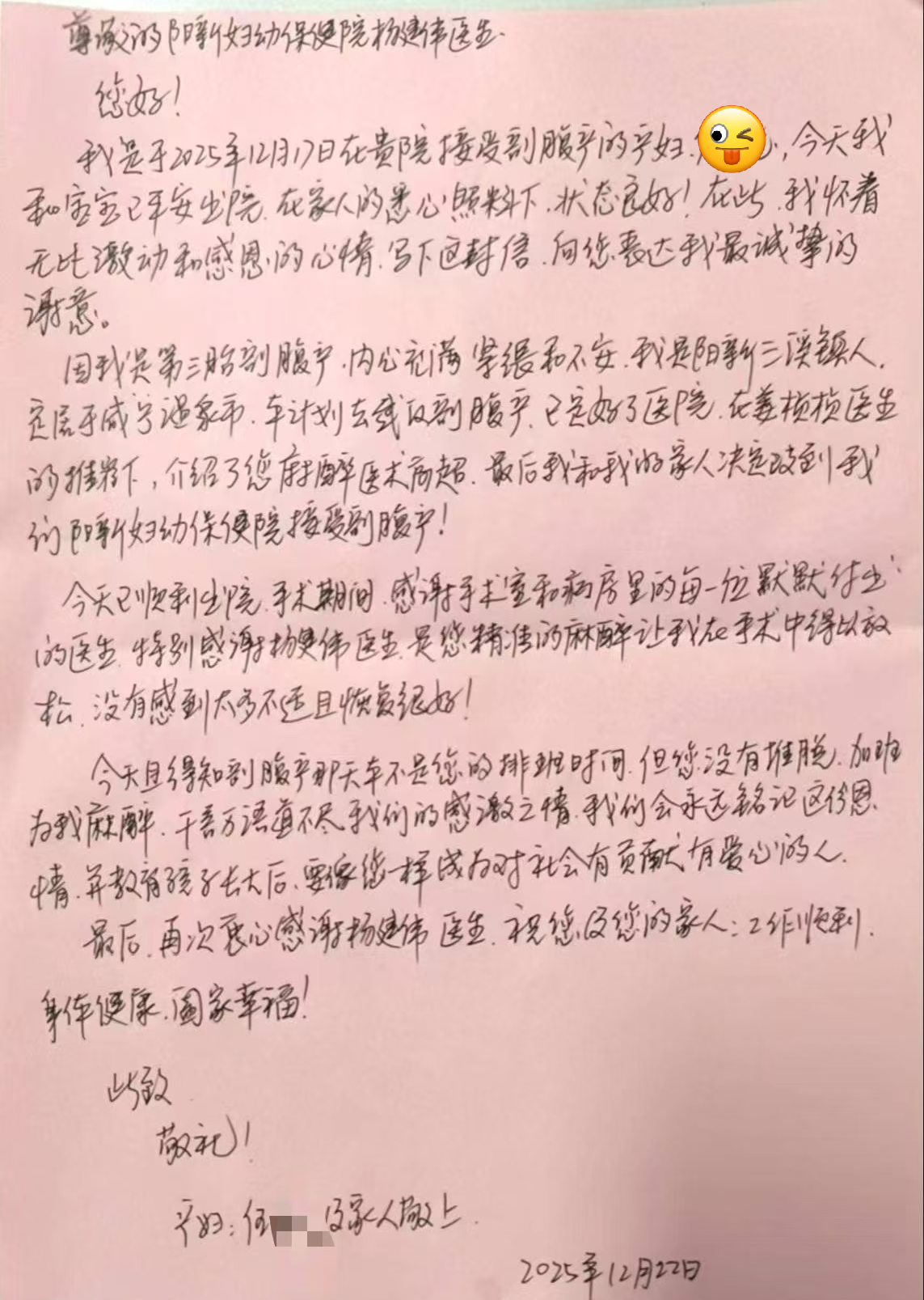 在医护人员的共同努力下,伍女士恢复良好,新生儿各项指标正常。出院当天,她和家人特意送来了亲笔书写的感谢信,表达对阳新县妇幼保健院产科钱超主任团队和麻醉科杨建伟主任团队最崇高的敬意和最真挚的感谢。