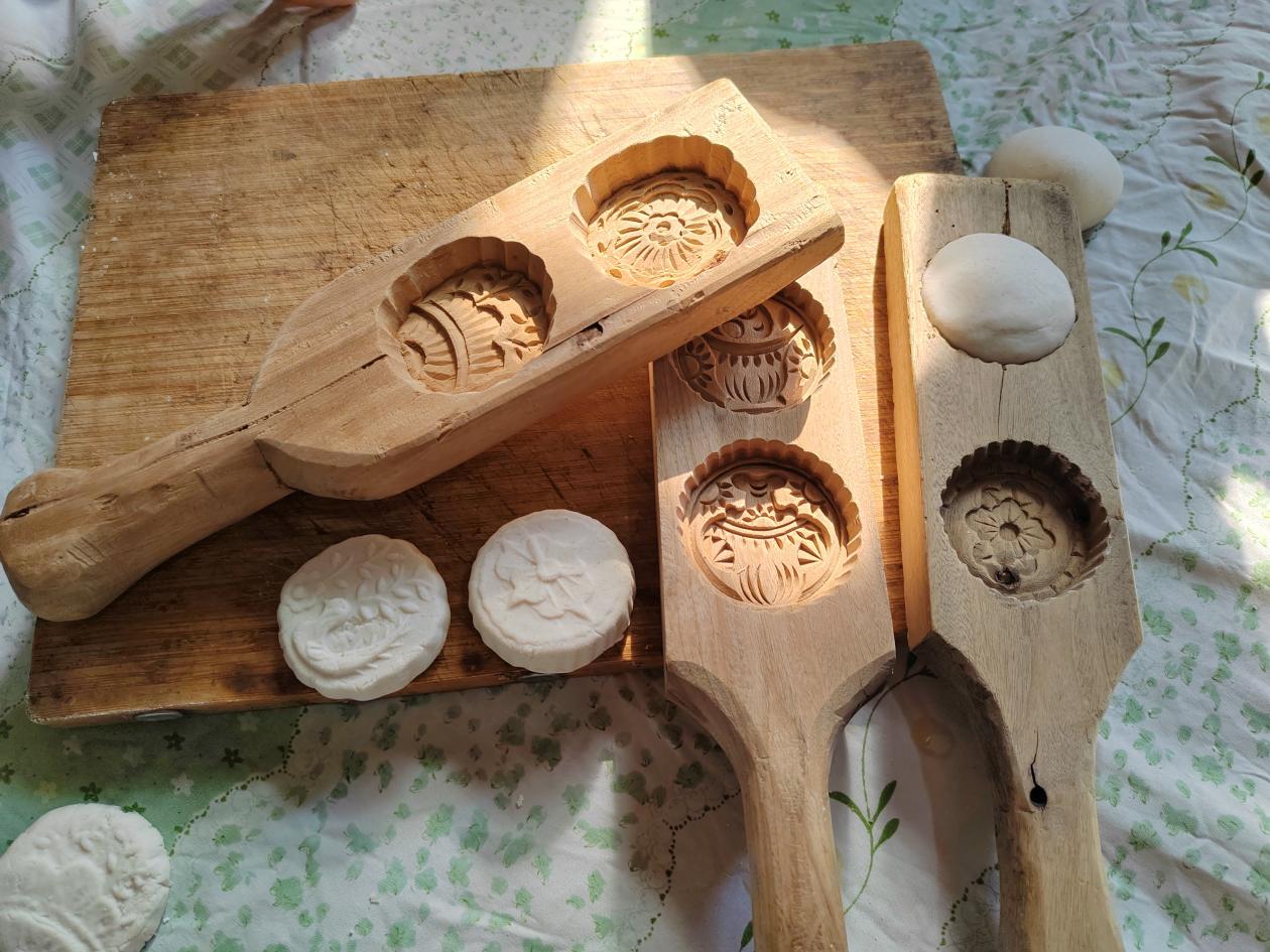 客厅里、灶台旁,大家分工协作、默契十足。和好的糯米团洁白温润,按压成大小均匀的圆饼,再填入刻有反向花草、鸟兽等图案的木制粑印中。模具上的纹样栩栩如生、各有韵味,轻轻一磕,一个个印着精美图案的印子粑便成型了,每一道纹路里都藏着村民对新一年的美好期盼。
