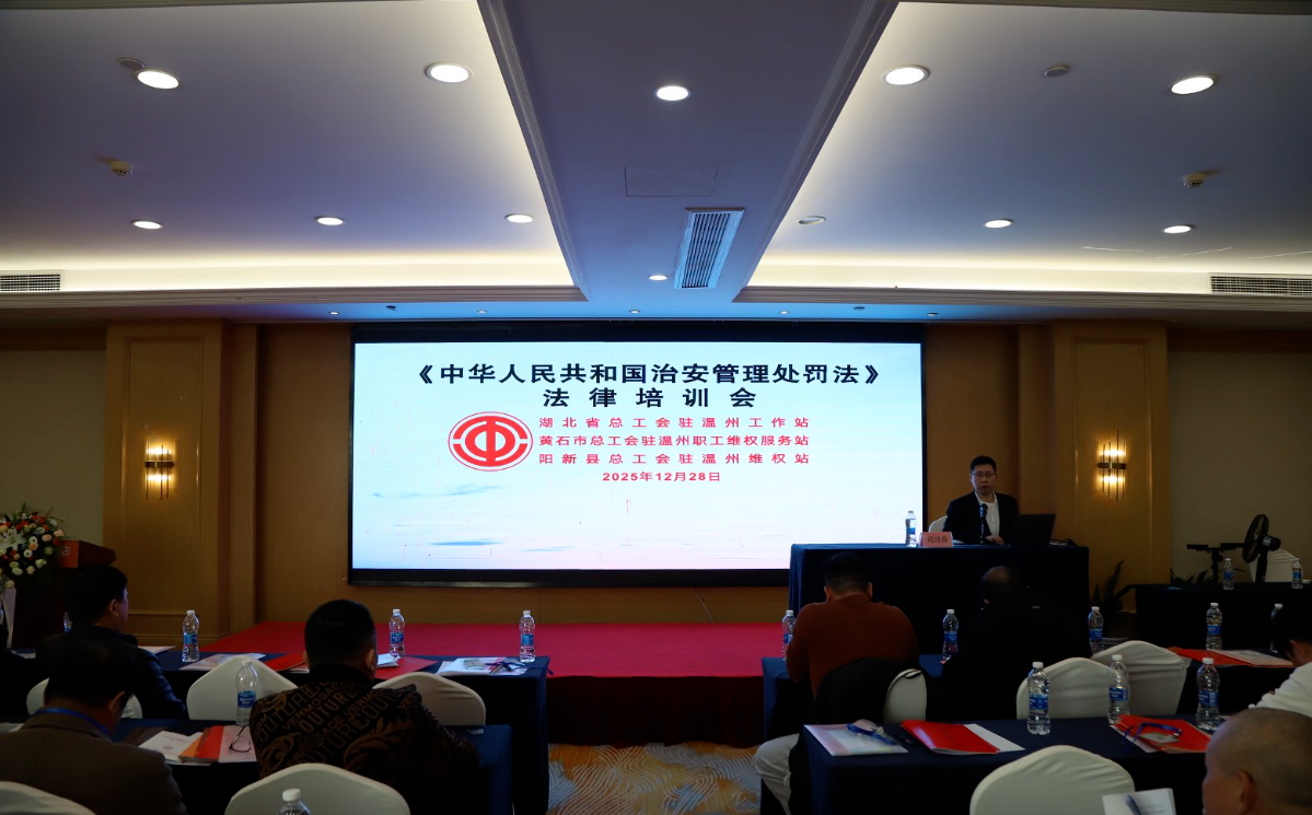 2025年12月28日,湖北省总工会驻温州维权站联合黄石市、阳新县总工会驻温州职工维权服务站,共同举办《中华人民共和国治安管理处罚法》专题法律培训会,旨在帮助在温湖北籍职工群众及时了解新法内容,提升法律意识与自我保护能力。近130名湖北籍流动党员、企业家、职工及家属、媒体工作者参与学习。