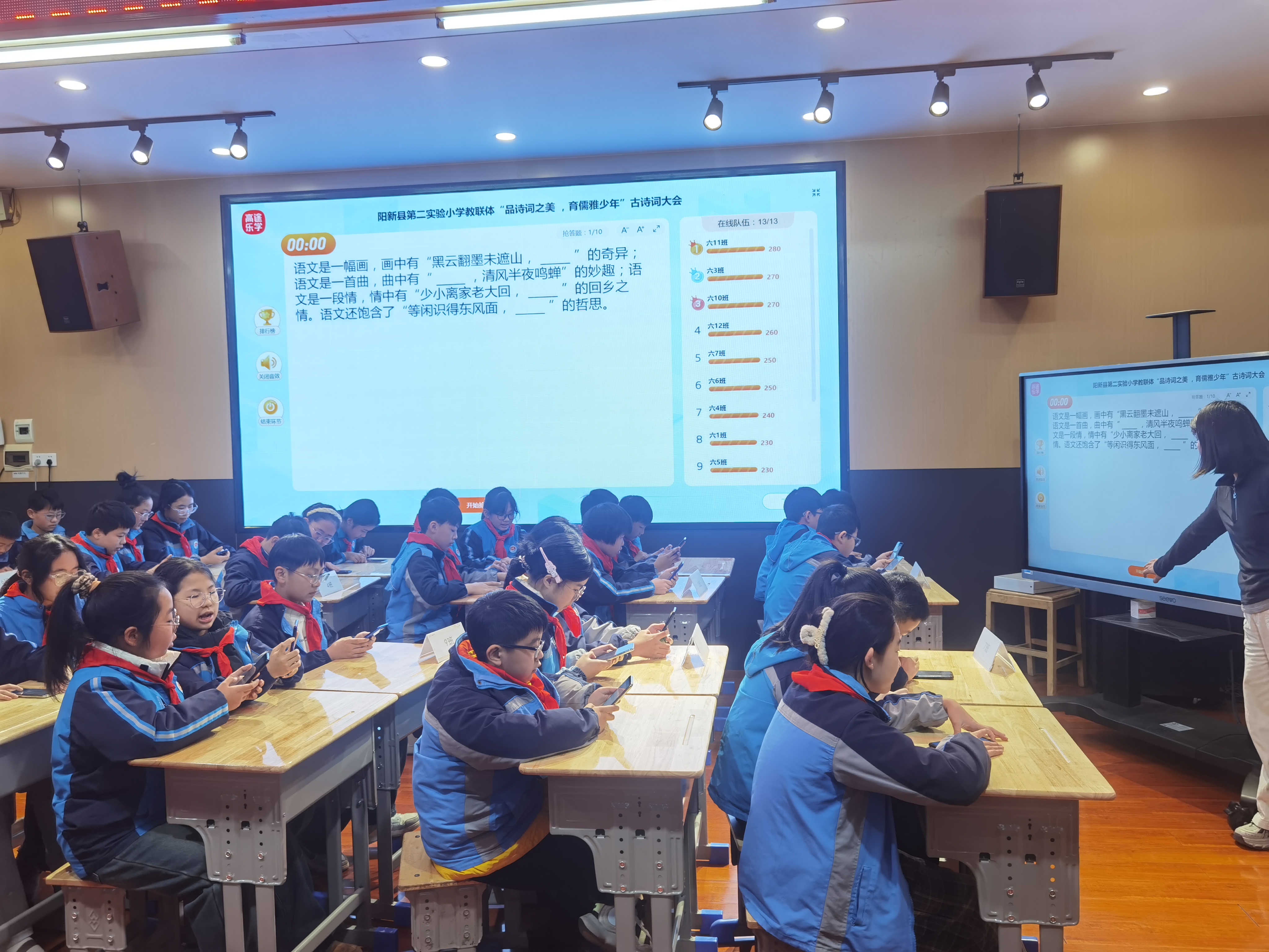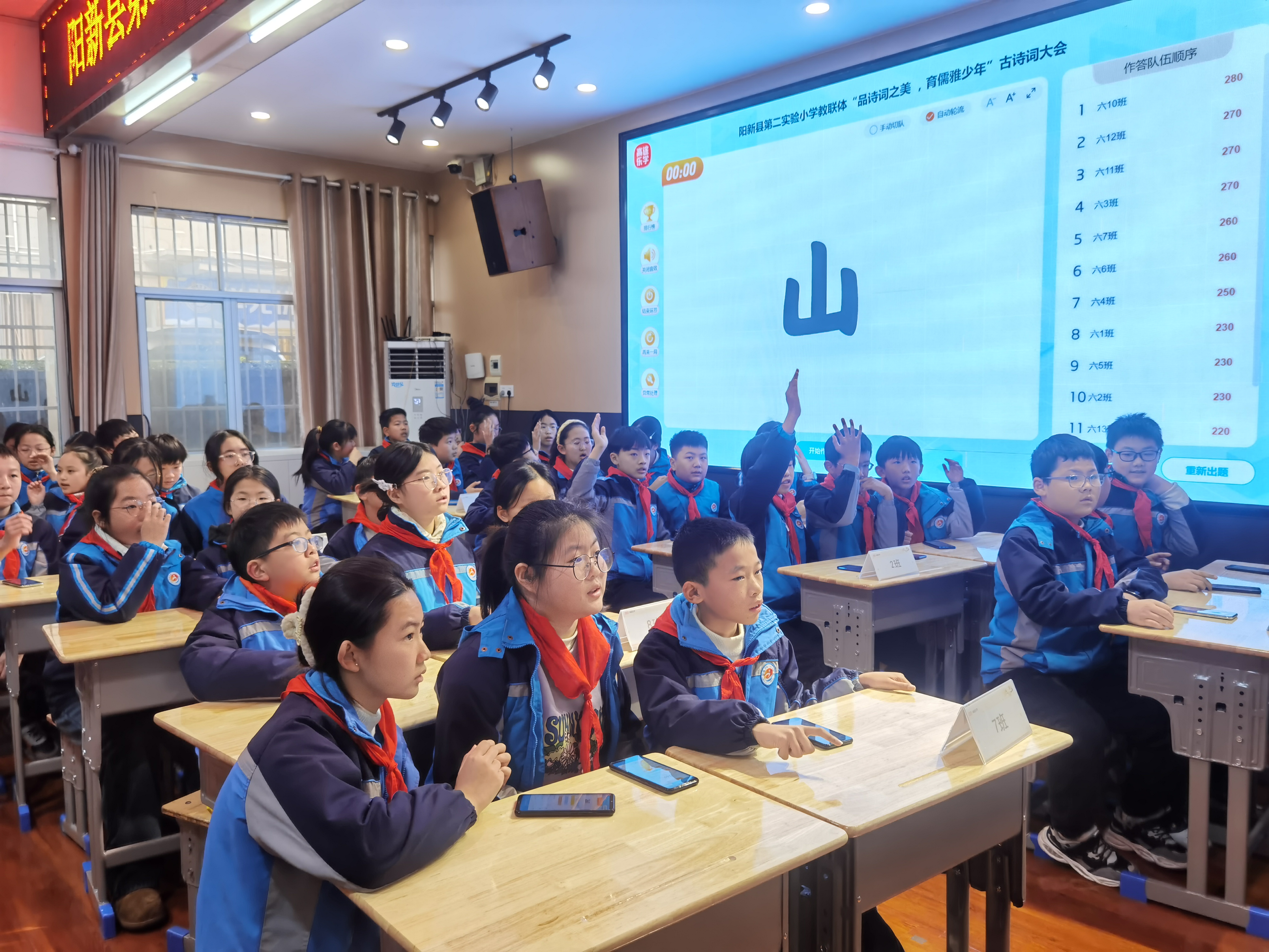 此次古诗词大会历时月余,自11月28日起,1-6年级全体学子借助“高途乐学”平台开启线上诗词闯关之旅。20关的层层递进中,选择题、填空题、连线题等多元题型相映成趣,文化感知、识记默写、理解领会、分析运用、综合拓展五大能力维度全面考量。学生们每日解锁两关,在8分钟的限时作答中与李杜对话、和唐宋共鸣,于指尖跃动间积累88首必背古诗与35首爱国题材诗词的精髓。最终,每班3名诗词达人凭借累计答题星数与答题速度的双重优势脱颖而出,携满腹诗才晋级线下决赛。