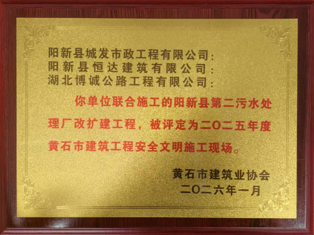 近日,黄石市建筑工程安全文明施工评选结果揭晓,由阳新城发集团公司下属阳新县恒达建筑有限公司与阳新县城发市政工程有限公司联合承建的阳新县第二污水处理厂改扩建工程,凭借其高标准、严要求的安全管理和文明施工水平,荣获“二〇二五年度黄石市建筑工程安全文明施工现场”奖项。