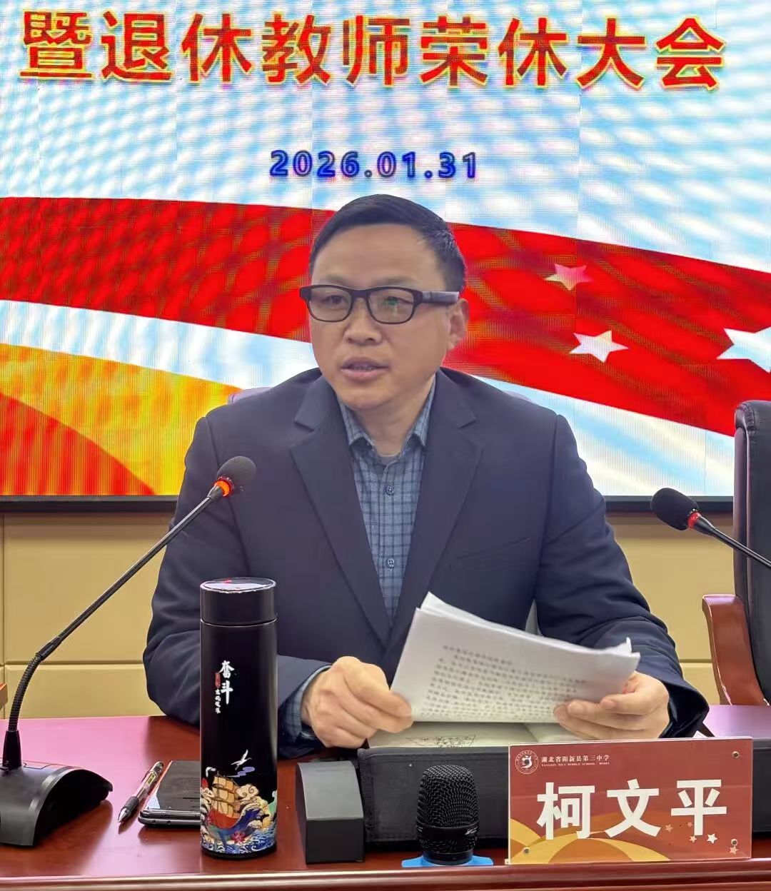 柯文平书记在讲话中感谢上级部门与学校师生的信任,并以“传承、赋能、创新、共享”为主线,提出六方面工作思路:强化党建引领;深化育人理念,推进“3060”课改;聚焦教学质量与学科建设;搭建教师专业成长平台;深化家校社协同;廉洁奉公,建设清廉校园。他强调,2026年是“十五五”开局之年,全体教职工应同心协力,共同推动学校发展。他还建议教师利用寒假阅读、观影,参与“劳动之星”等评选活动,促进全面成长。