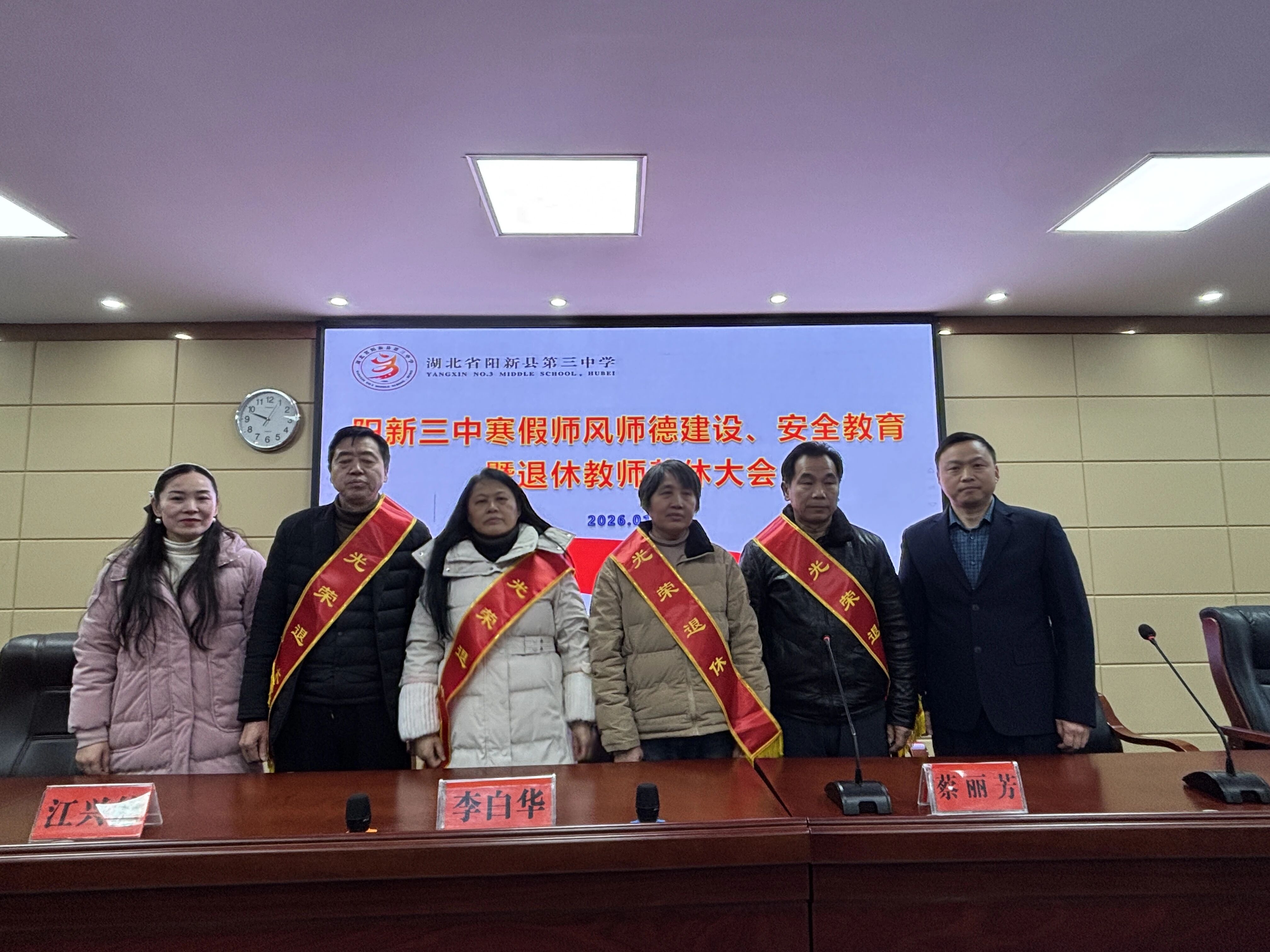 1月31日上午,阳新县第三中学召开师德师风建设、安全教育暨退休教师荣休大会。学校党总支书记柯文平、校长余小芳等领导班子成员及全体教职工参加会议。会议由余小芳校长主持。
