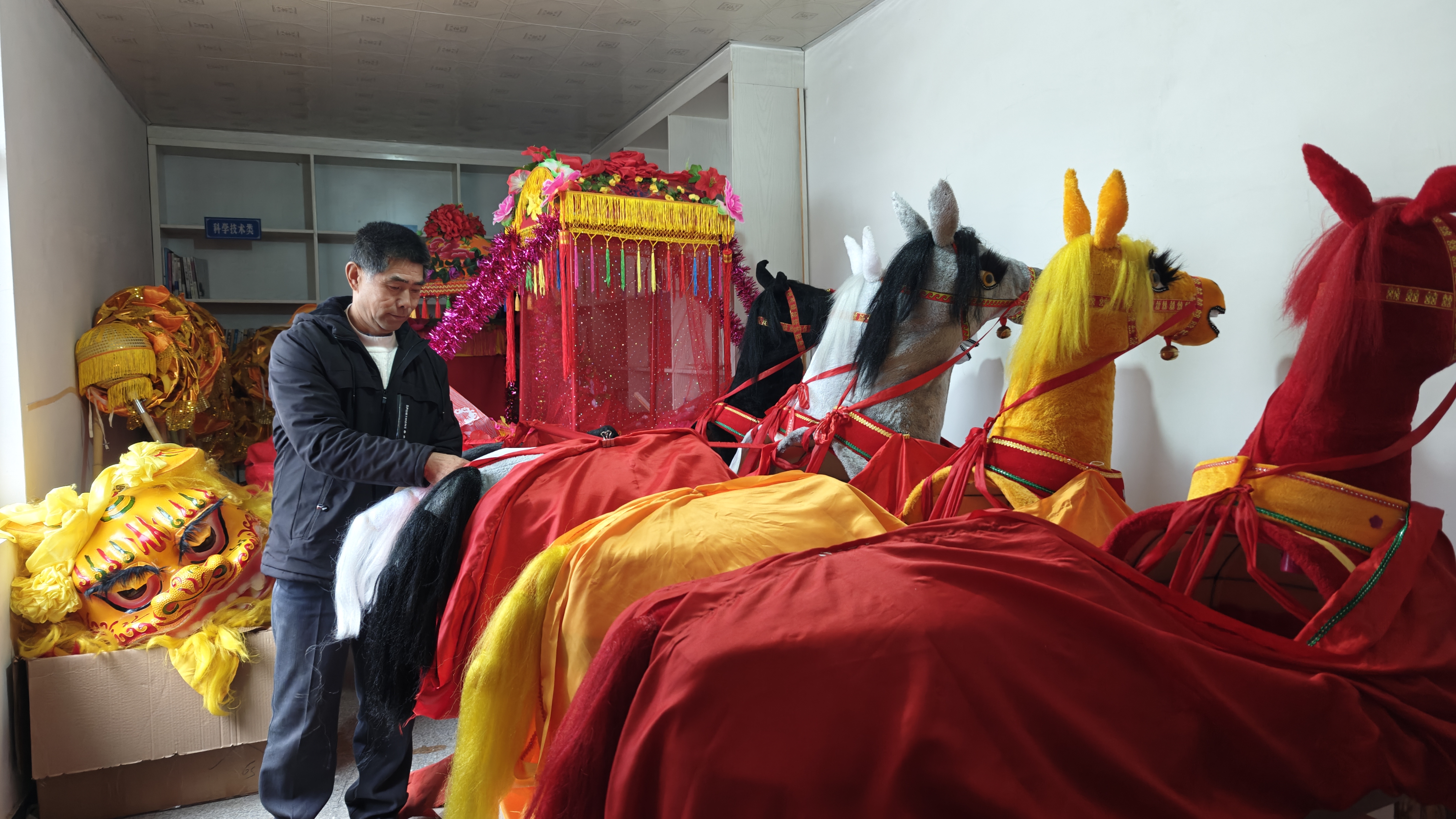 在大湖村,村委会副主任王贤斗将尘封已久的彩莲船、龙狮、竹马等传统民俗表演道具仔细取出、擦拭、整理。这些道具承载着村庄的历史记忆,是每年“村晚”不可或缺的文化符号。