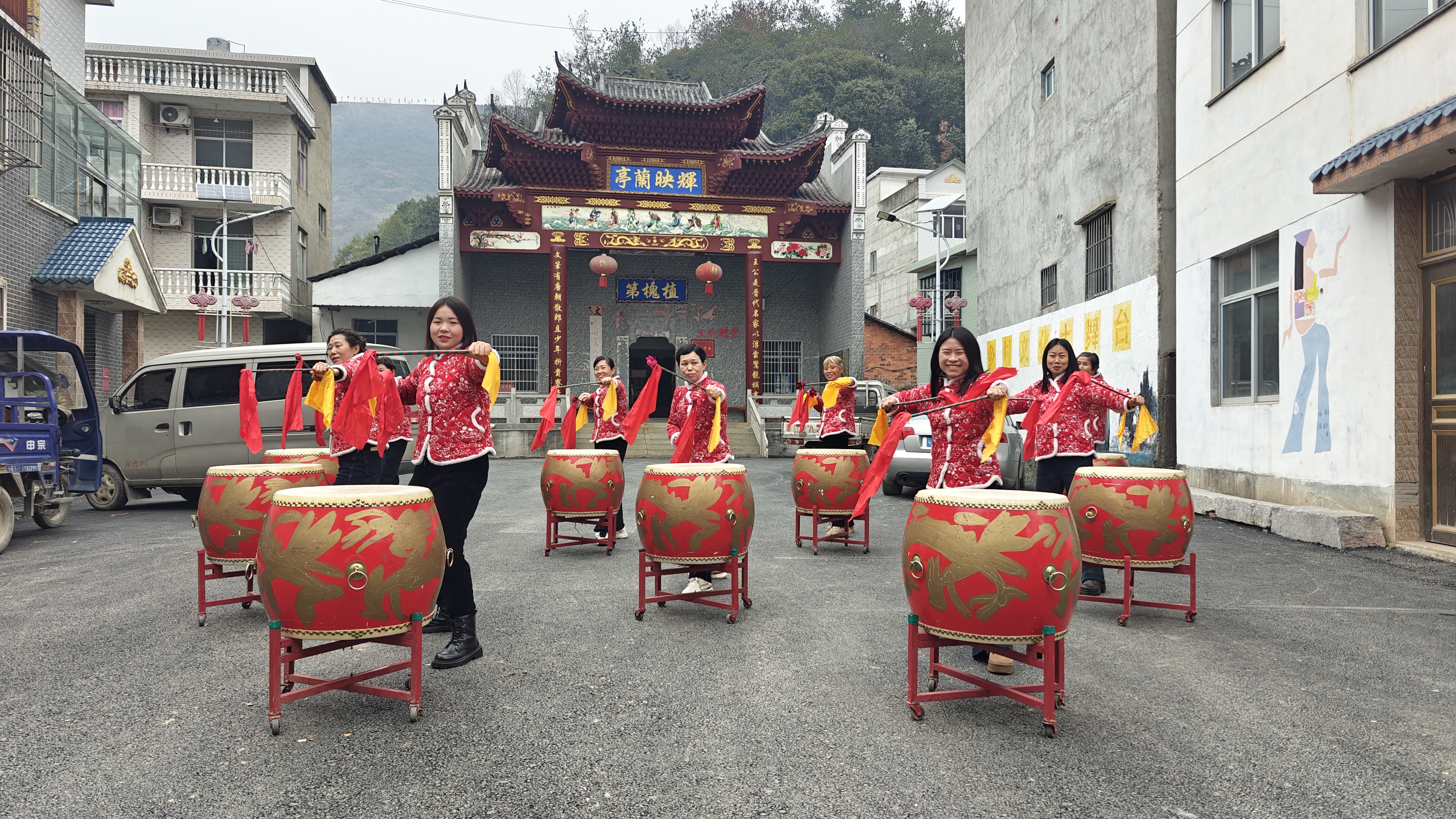 与此同时,王文村的广场上则充满了蓬勃的活力。一支由本村妇女组成的表演队,正热火朝天地排练鼓乐和扇子舞。她们用饱满的热情和辛勤的汗水,为“村晚”注入崭新的时代气息。