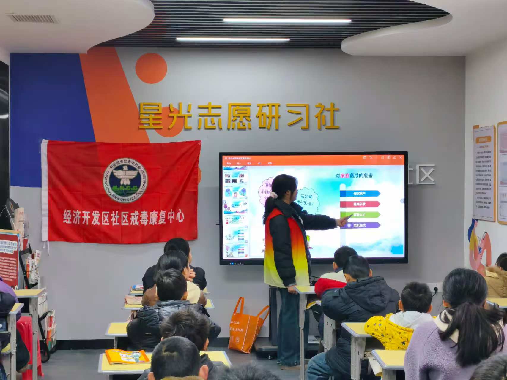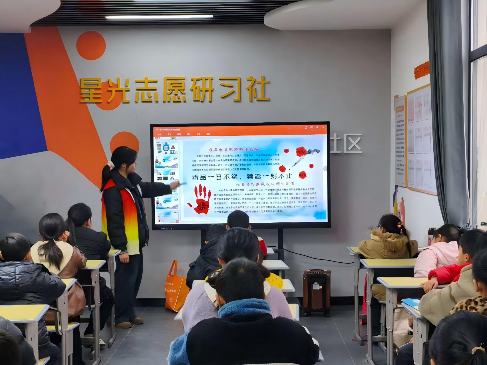 禁毒护成长,青春不“毒”行。2月6日上午,阳新经济开发区火车站社区联合经济开发区社区戒毒康复中心,在社区“驿家周末课堂”开展“珍惜生命 远离毒品”主题科普活动。大学生志愿者以PPT演示、案例讲解、互动问答相结合的趣味形式,引导孩子们认清毒品危害、学会自我防护,以细微之举筑牢青少年禁毒思想防线。