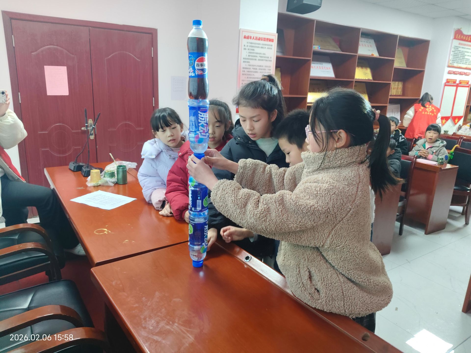 仪式伊始,备受期待的团队协作游戏“摞瓶子”率先点燃现场氛围。小朋友们迅速分组,在志愿者的引导下投入到这场智慧与协作的比拼中。大家分工明确、默契配合,有的小心翼翼调整瓶身角度,有的轻声沟通摆放策略,现场加油声与欢呼声此起彼伏。尤为亮眼的是一组小朋友突发奇想,巧用胶布将瓶身巧妙缠绕固定,凭借这一充满创意的解决方案,成功让瓶子稳稳矗立,最终斩获“最高摞瓶”称号,充分展现了孩子们的创新思维与团队凝聚力 。游戏不仅为孩子们带来了欢乐,更让他们在实践中深刻体会到“独木难成林,合作出力量”的道理。