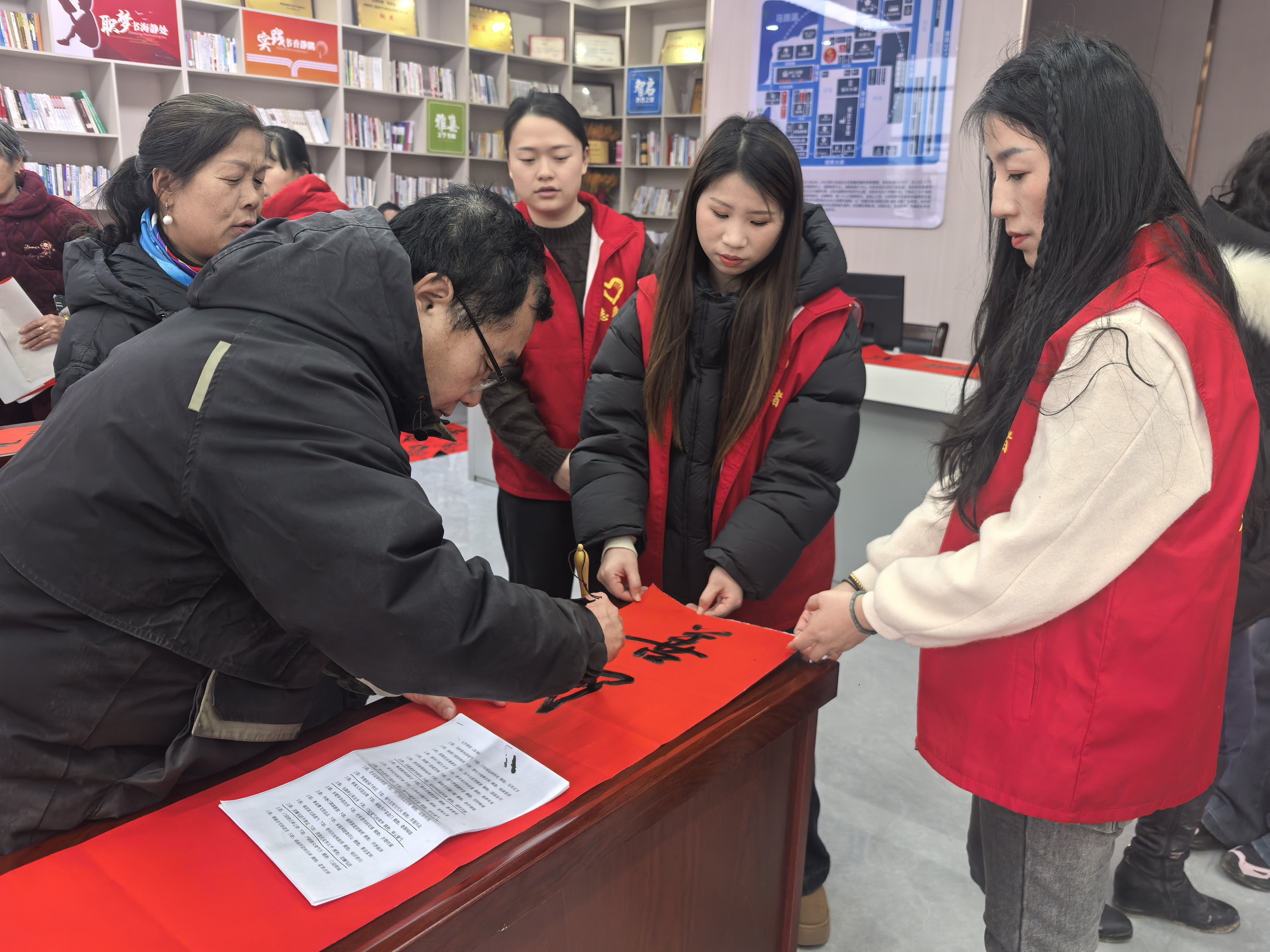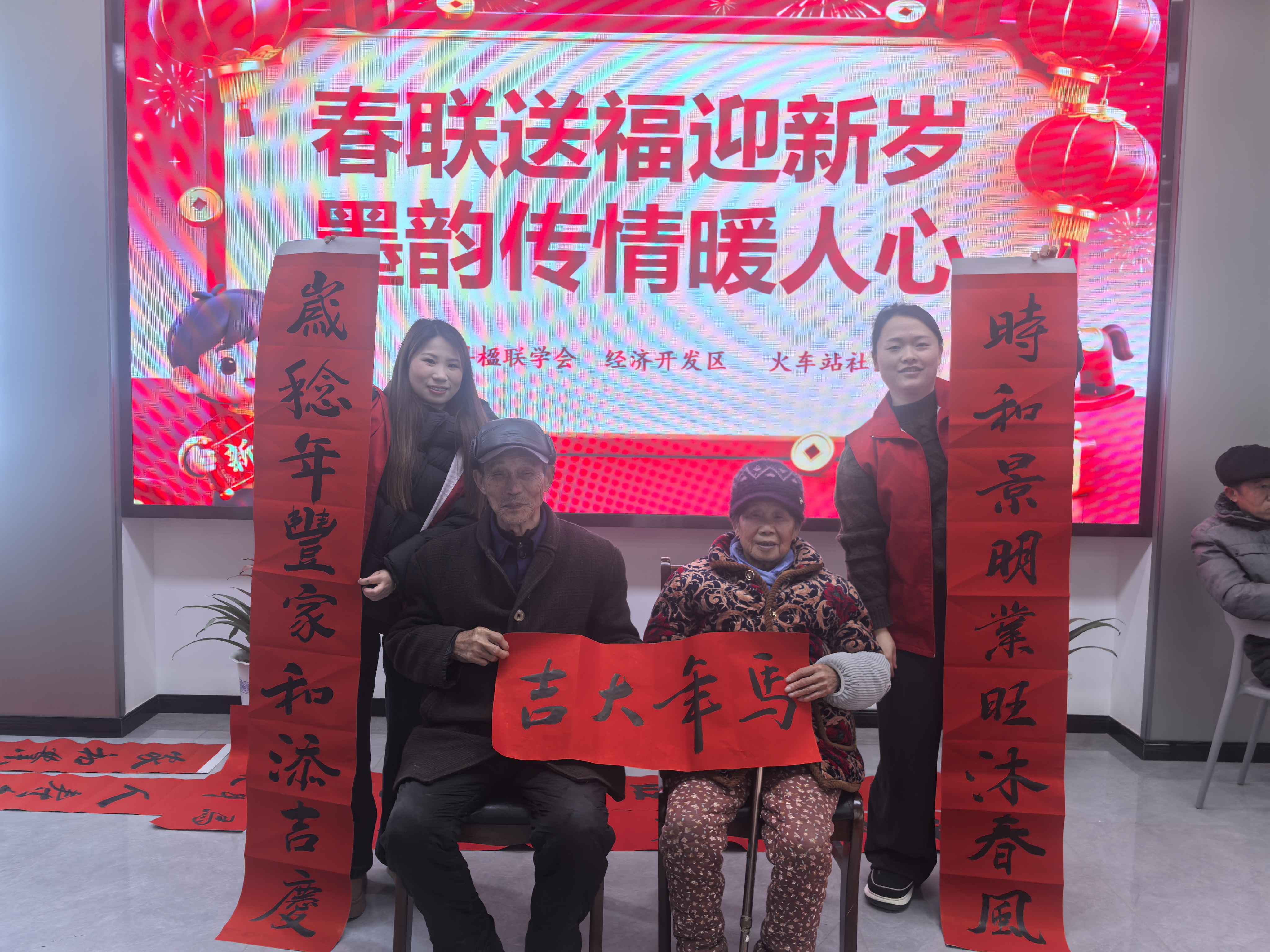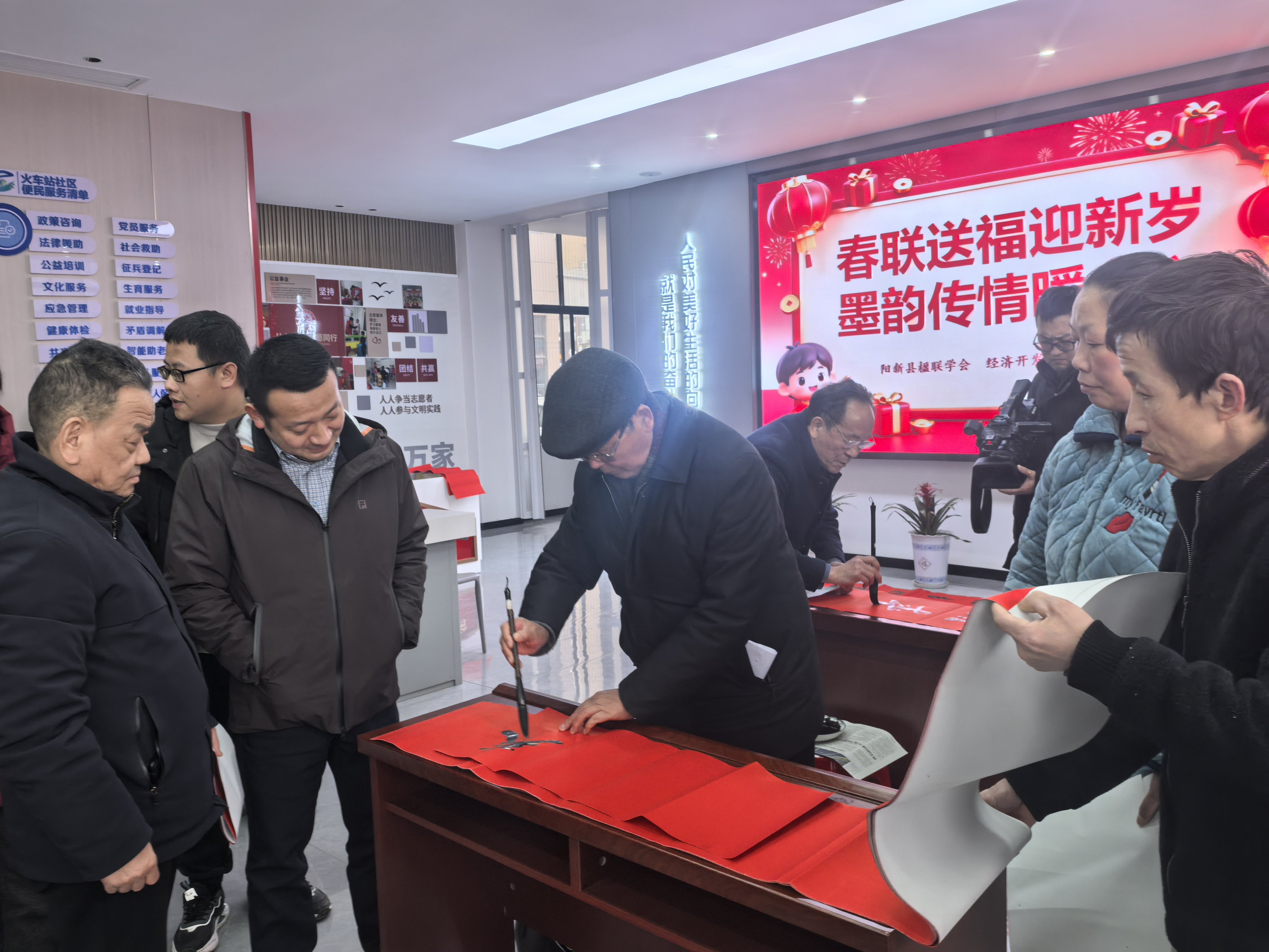 2月7日下午,阳新县楹联学会联合经济开发区、火车站社区开展“春联送福迎新岁 墨韵传情暖人心”送春联进社区活动。县楹联学会会长向能来携多位楹联家走进火车站社区,为辖区困难群众、“五老”人员现场挥毫泼墨,免费书写春联,让浓浓墨香与暖暖温情交织,给即将到来的马年新春增添了醇厚的文化年味。