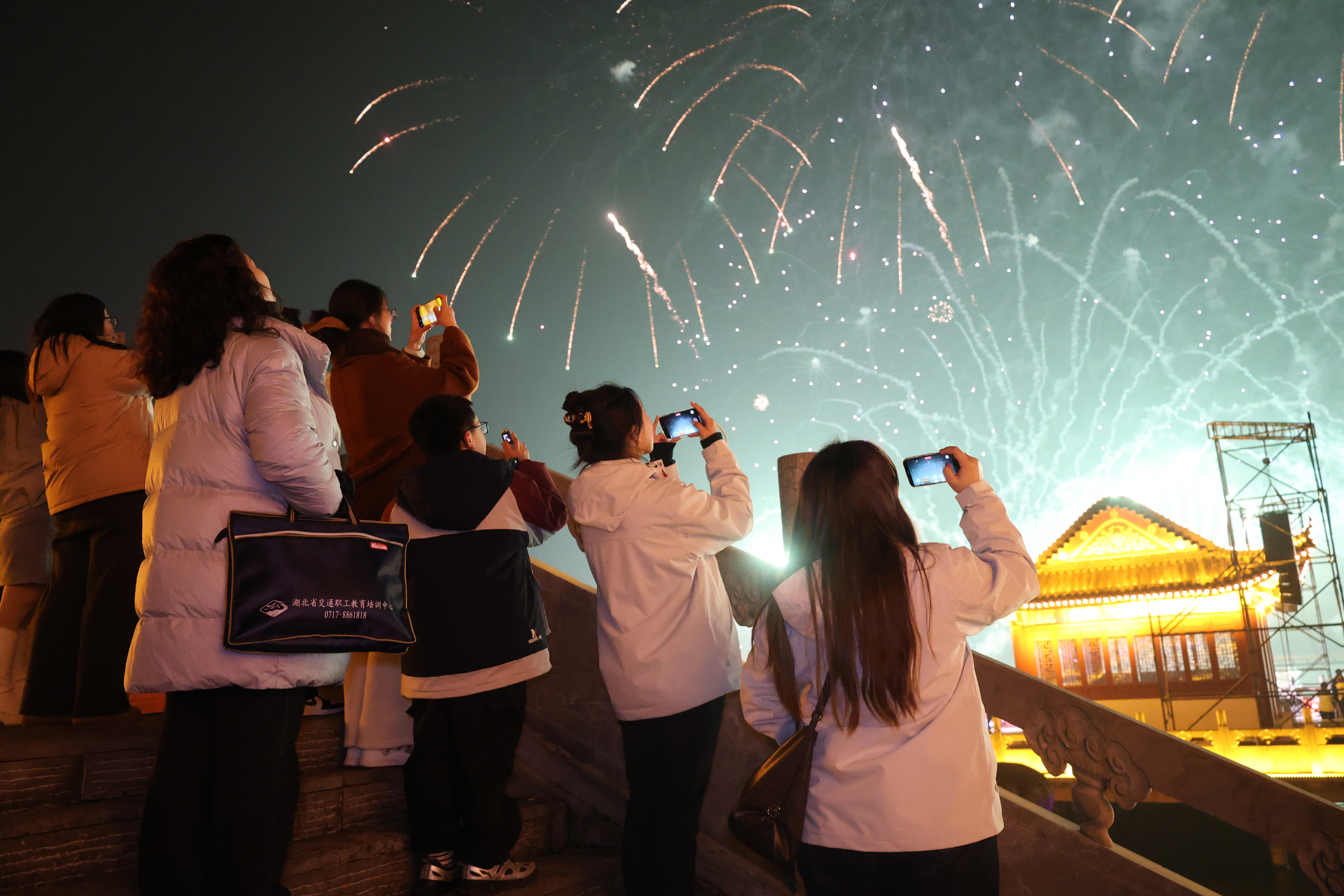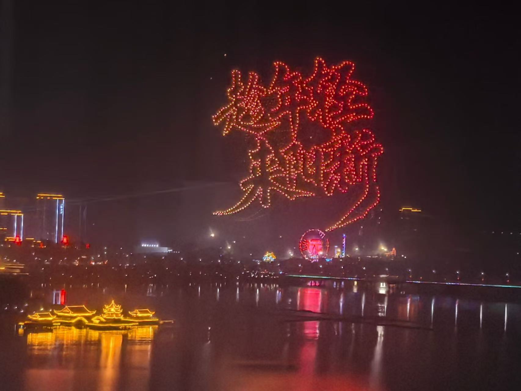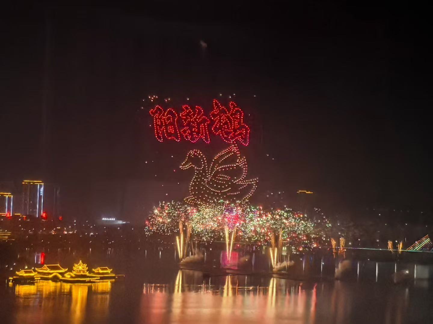 晚上8点,伴随倒计时声落,焰火秀在序曲《祥瑞汇聚·喜迎新春》中拉开帷幕。无人机编队与焰火精准交织,千架无人机凌空变幻,先后呈现“万马奔腾”“三面旗帜”“鱼米之乡”“阳新屯鸟”“趁年轻来阳新”“我爱你中国”等图案——项目建设、工业强县、奋进百强的城市愿景,国家地理标志保护产品的乡土印记,以及对祖国深情的告白,在夜空次第点亮,赢得现场阵阵赞叹。