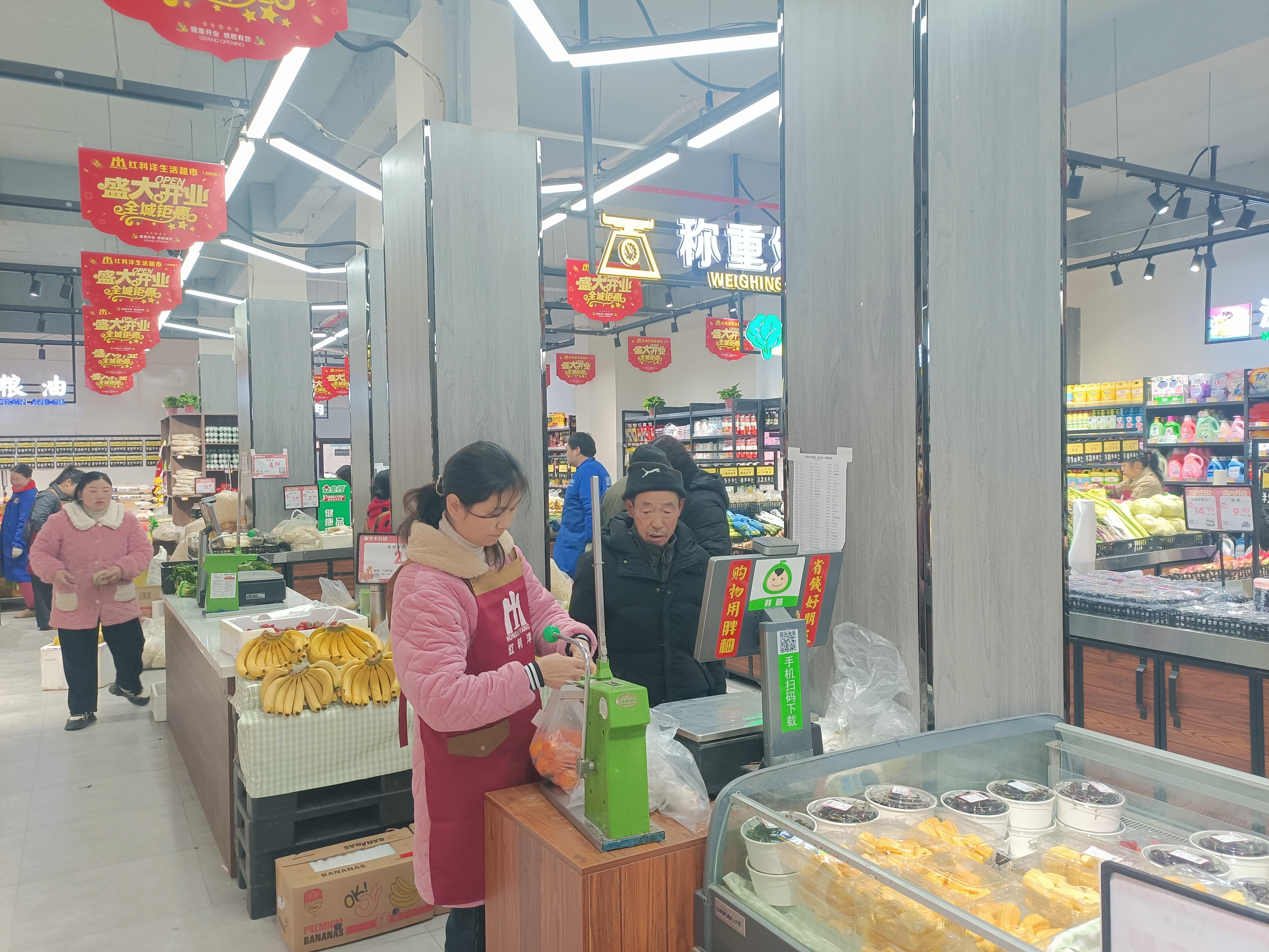 当天,在白沙铺高铁站广场年货节现场,顾客们正在有序购买各类新鲜牛羊肉。“这是我第三年来白沙镇年货节卖牛肉了,我就看准了白沙镇人流量大的优势,这次我的商品全部卖完了,明天就回家过年,明年我还来白沙做生意。”来自安徽省的商户刘老板开心地说。在镇区冶商平价、佳佳惠等大型超市里,从食品到日用品应有尽有,各类生熟食品和新鲜水果摆满了货架,供顾客们精心选购。