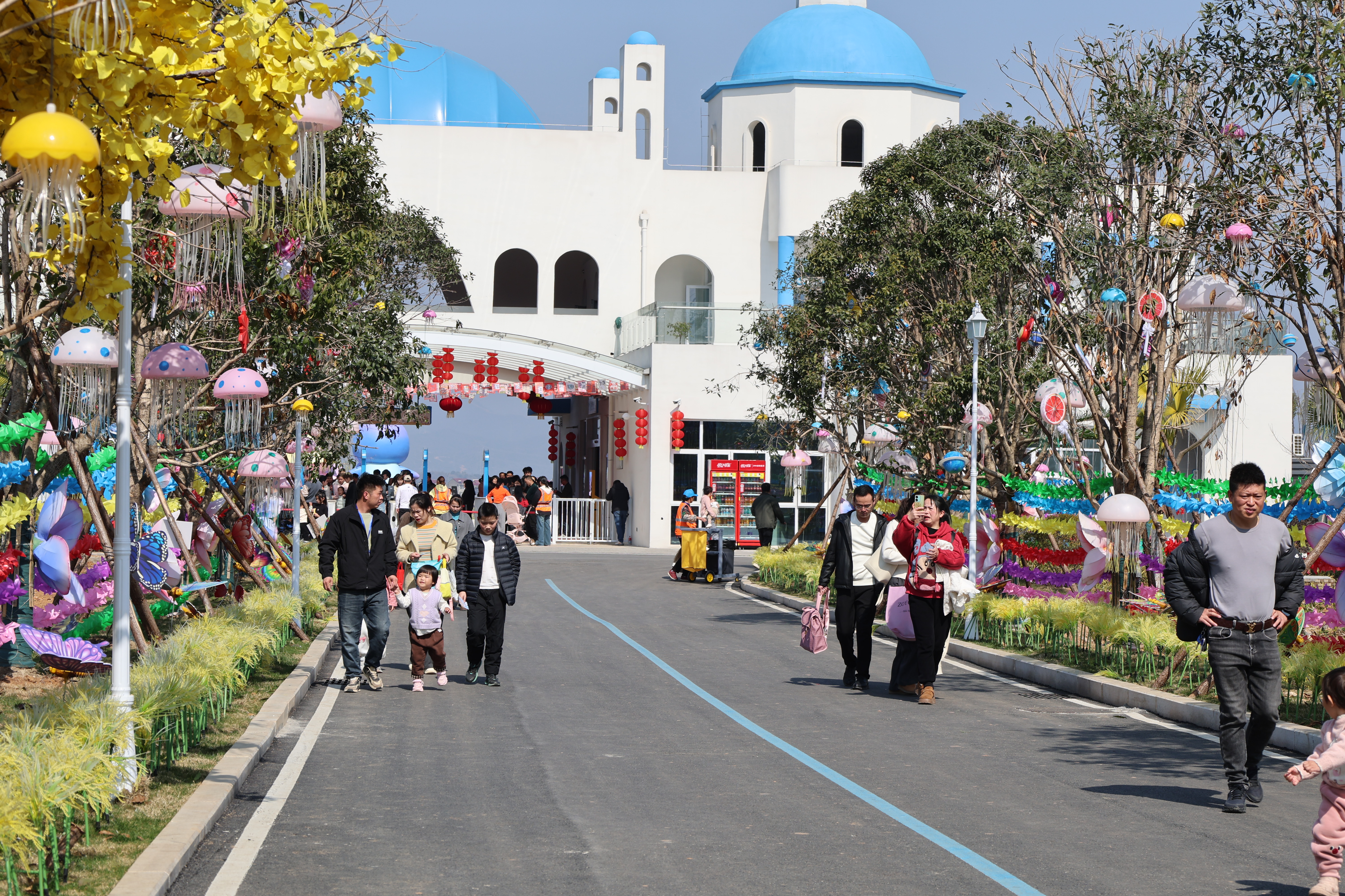 今日恰逢情人节,旅游区以“阳光海岸·棕榈银滩”为主题IP,在这个充满爱意的日子里,为游客呈现了一座充满异域海岛风情的“中国爱情海”。从圣托里尼风格的度假酒店到棕榈婆娑的银滩,浪漫元素遍布每个角落,吸引了大量情侣和家庭游客前来打卡体验。