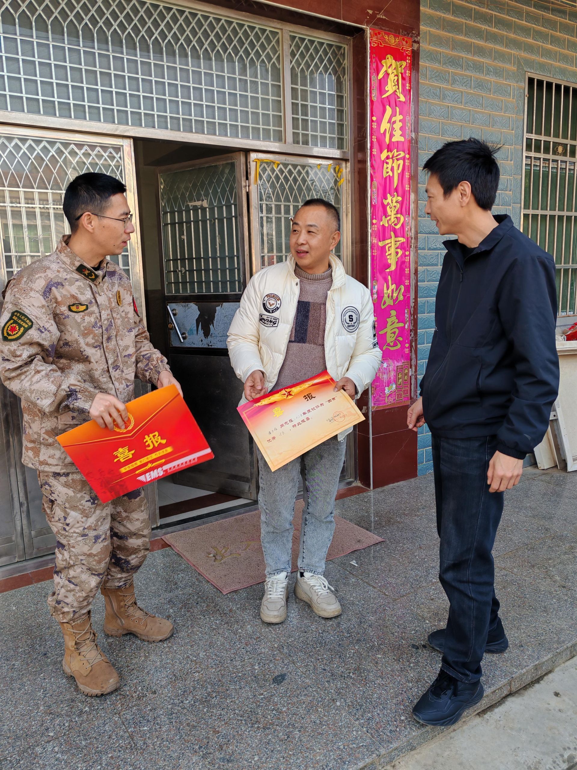 新春将至,喜讯频传。2月14日,黄颡口镇退役军人事务站联合镇武装部,组成送喜报慰问组,前往程法、太平、凤凰等村,为获评“四有”优秀士兵的现役军人家庭送喜报、送关怀。