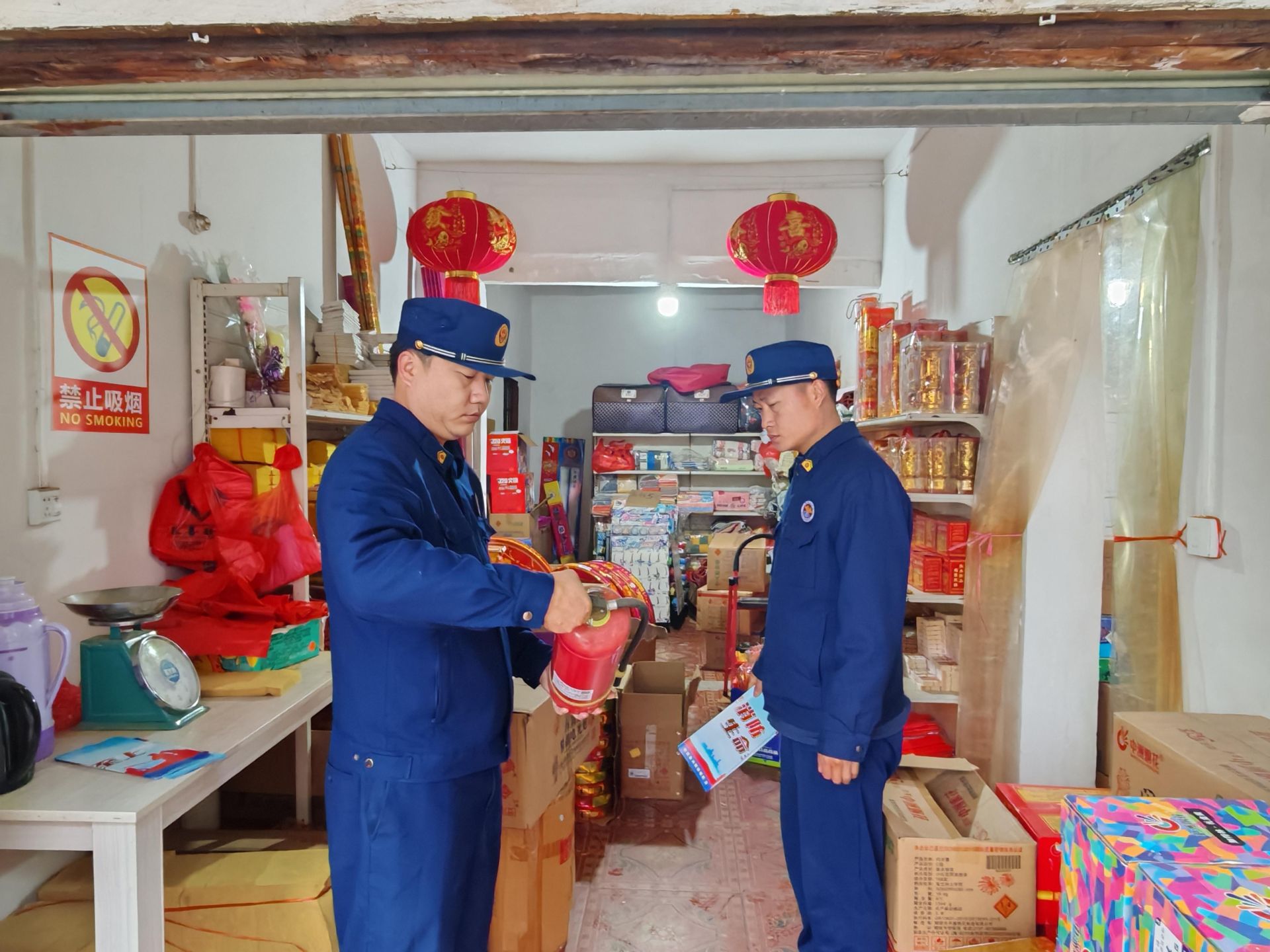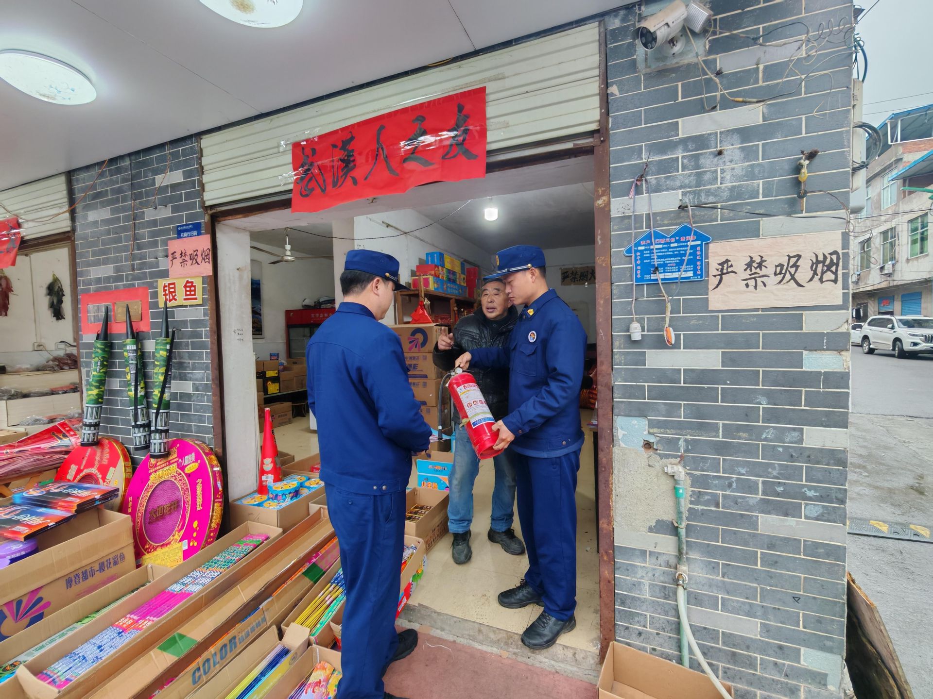 “老板,这个灭火器马上就要到有效期了,记得要及时更换,确保关键时刻能拿得出、用得上。”在镇区一家烟花爆竹零售点,消防工作人员重点对经营户的营业执照、烟花爆竹储存量、消防器材配备以及警示标识张贴情况进行了细致核查。