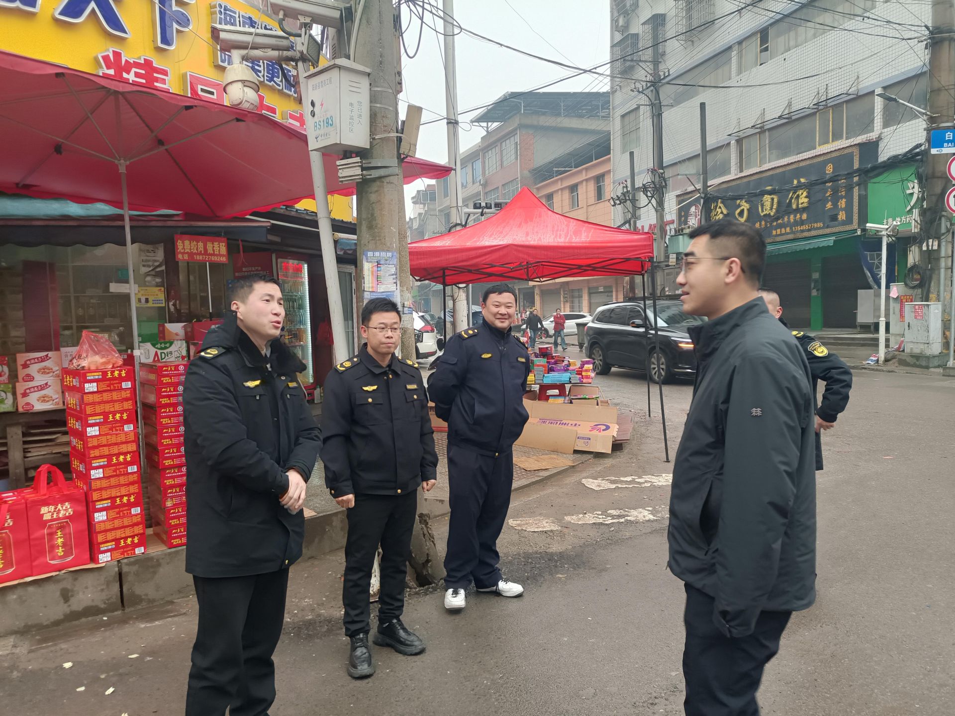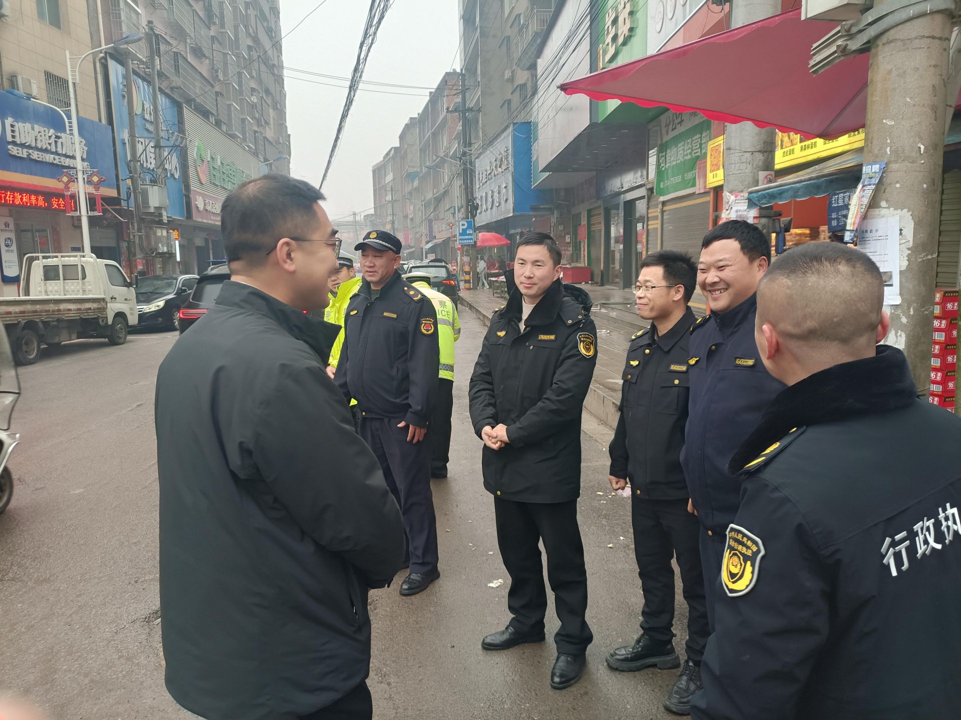 在老街信用社路口,镇综合执法中心和村镇建设服务中心工作人员,县公安局交通管理大队四中队民辅警,正在路口执勤指挥镇区各路段交通,慰问组分别送上了新春祝福。