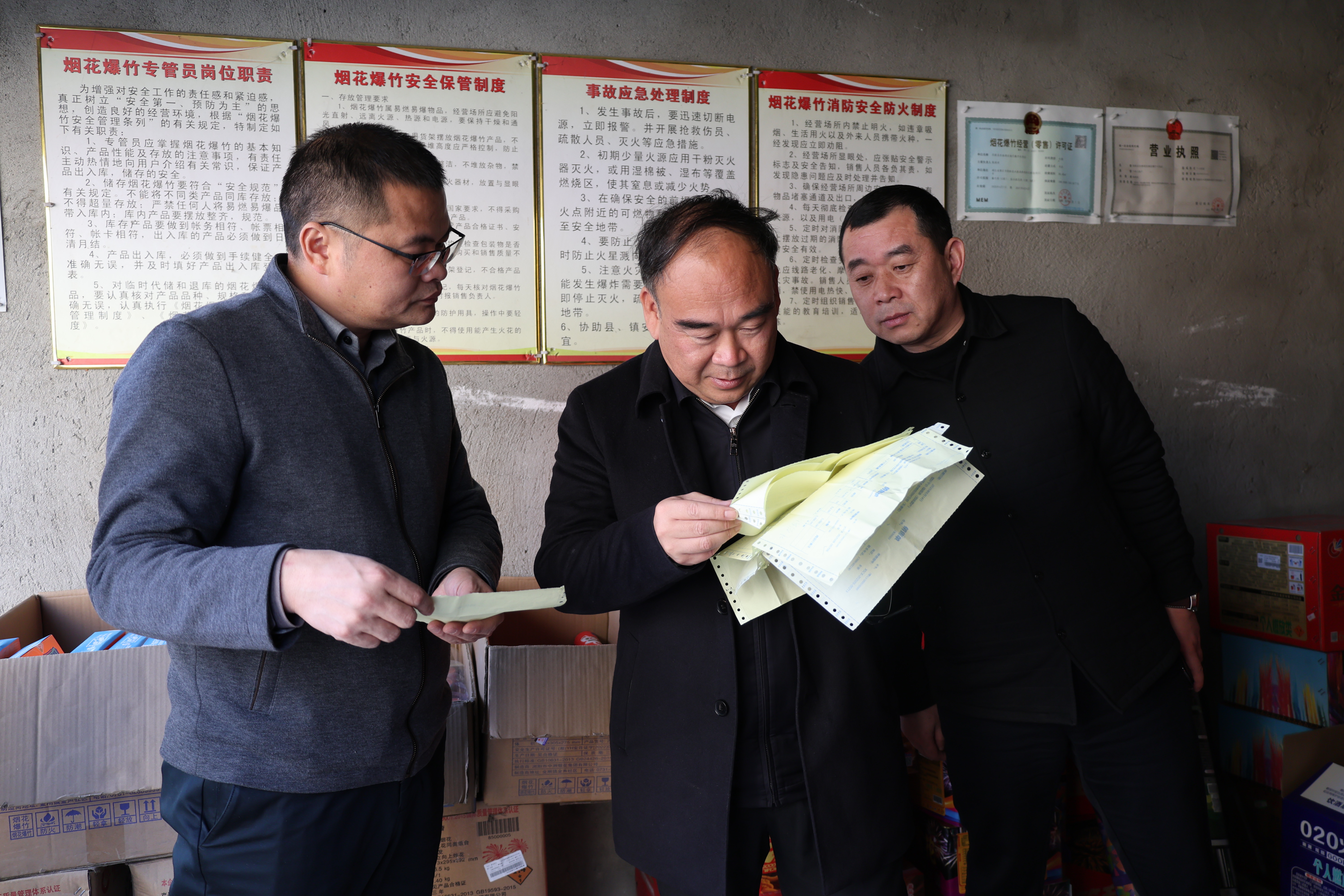 杨波先后检查了枫林镇、木港镇多家烟花爆竹零售店,仔细查看企业证照是否齐全、经营范围是否符合规定,重点检查是否存在超规格、超数量储存烟花爆竹等行为。他指出,经营户必须严格落实安全生产主体责任,严禁在销售点内超规格囤积烟花爆竹。应急管理、公安、市场监管等部门要坚决落实行业监管责任,加强常态化巡查指导,确保烟花爆竹运输、储存、销售全链条安全可控。