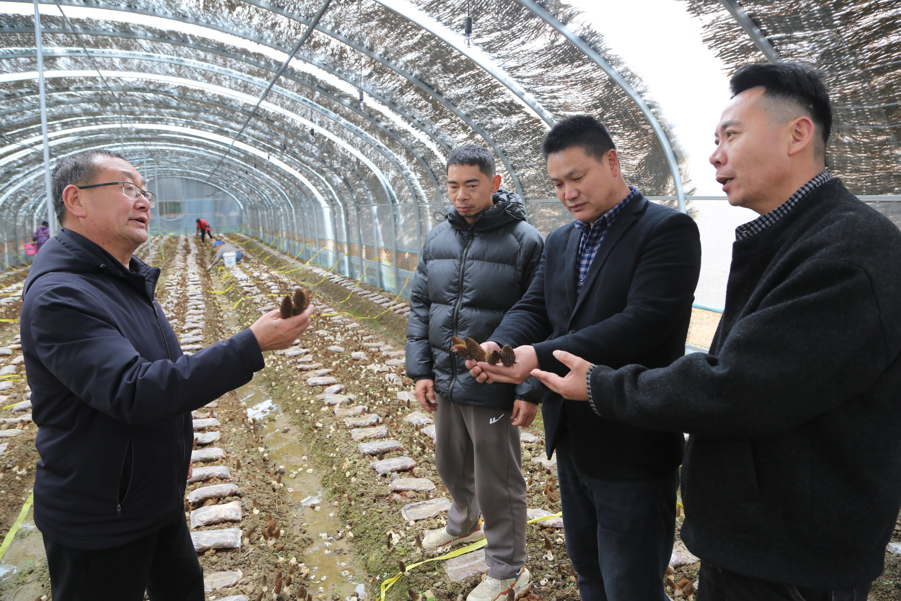 柯德刚充分盘活村里废旧大棚,进行标准化升级改造,2025年11月顺利完成下种。如今,14个大棚、近10亩羊肚菌迎来丰收,亩产鲜菌约1200斤,鲜菌市场价每斤高达80元,年产值近百万元,经济效益十分显著。