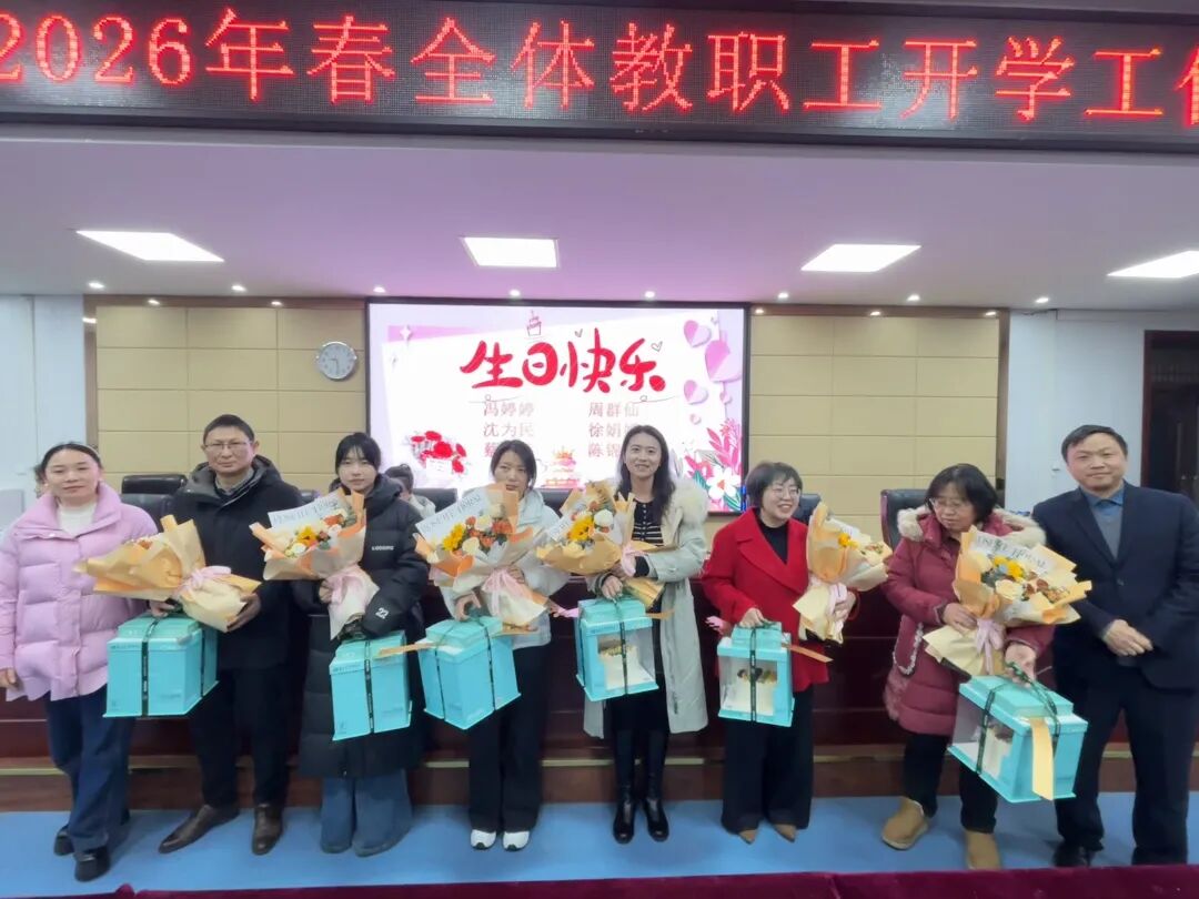 会议期间,学校还为近期生日的六位教师举办了简朴而温馨的集体庆生仪式,柯文平、余小芳分别为他们送上蛋糕与鲜花,全体教师共唱生日歌,现场气氛温暖感人。教师代表周群仙在发言中表达了对学校的深厚感情和继续奋斗的决心。青年教师明志鹏结合教育电影观后感,分享了自己的育人故事与班主任心得,引发了广泛共鸣。