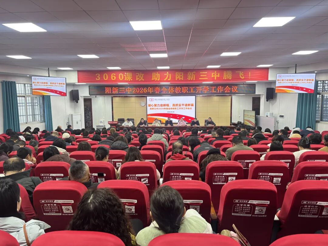 2月28日上午,阳新县第三中学召开2026年春季学期全体教职工开学工作会议。学校党总支书记柯文平、校长余小芳等两委成员及全体教师参会,共谋新学期发展蓝图。会议由余小芳主持。