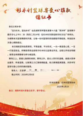 可这份筹款的难处,在近年来的赛事筹备中,已不再是什么大的困难。刚刚过去的2026年春节,便是杉木村首次承办这一盛大的篮球赛事。负责统筹的村干部王呈雨,起初心里还有些忐忑,在筹款之前,她还提前向村里在外发展的能人询问了捐款意愿,也做好了多费工夫的准备。可当捐款倡议书发布后,村民们的热情却远远超出了她的预期。从500元到5000元,不论数额多少,杉木村前前后后50多位村民倾尽心意、慷慨赞助,只为了让这场家门口的球赛办得更加热闹,短短时间内,捐款就累积到了7万余元。王呈雨原本还担心资金有缺口,到头来反而还可能有富余。这份变化,正是二十年来联赛常态化举办,在乡土间慢慢沉淀出的温暖回响。