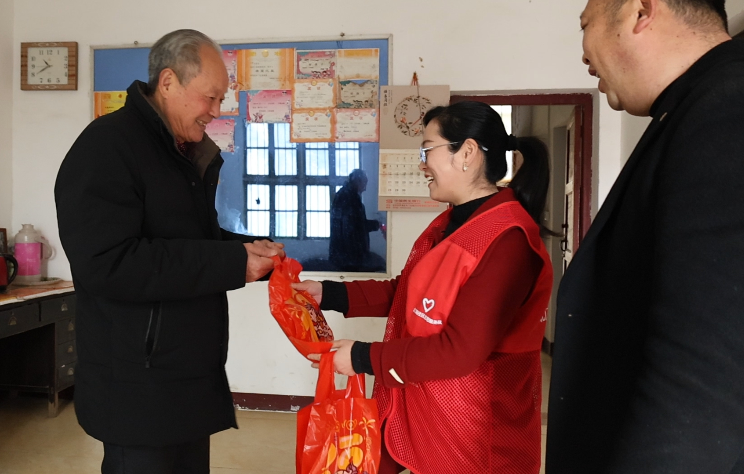 汤圆包好后,记者跟随管理区工作人员和志愿者,提着打包好的汤圆,来到了北门垴社区退休干部王洪喜家中。一进门,志愿者就将这份热乎乎的节日心意递到了老人手中。