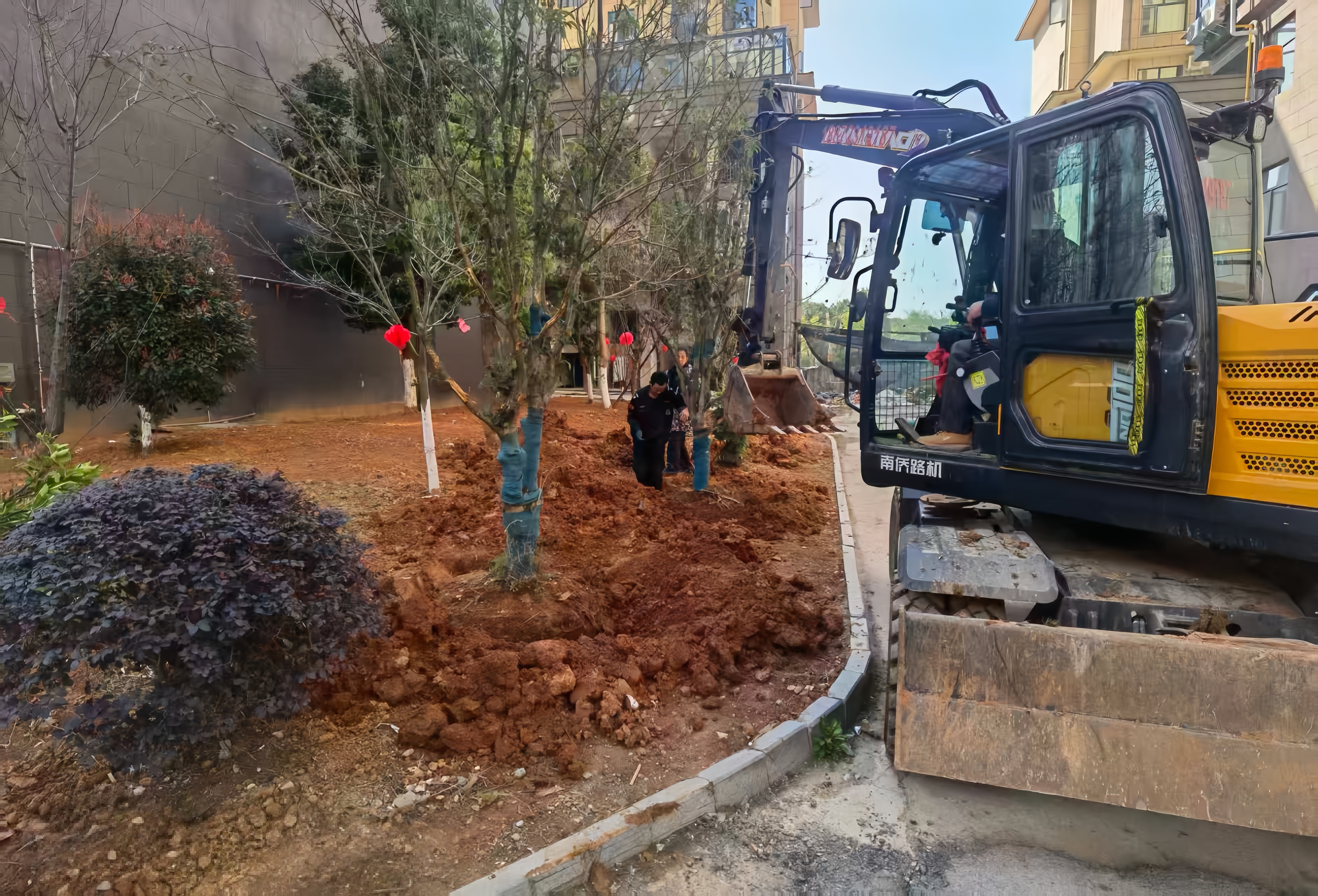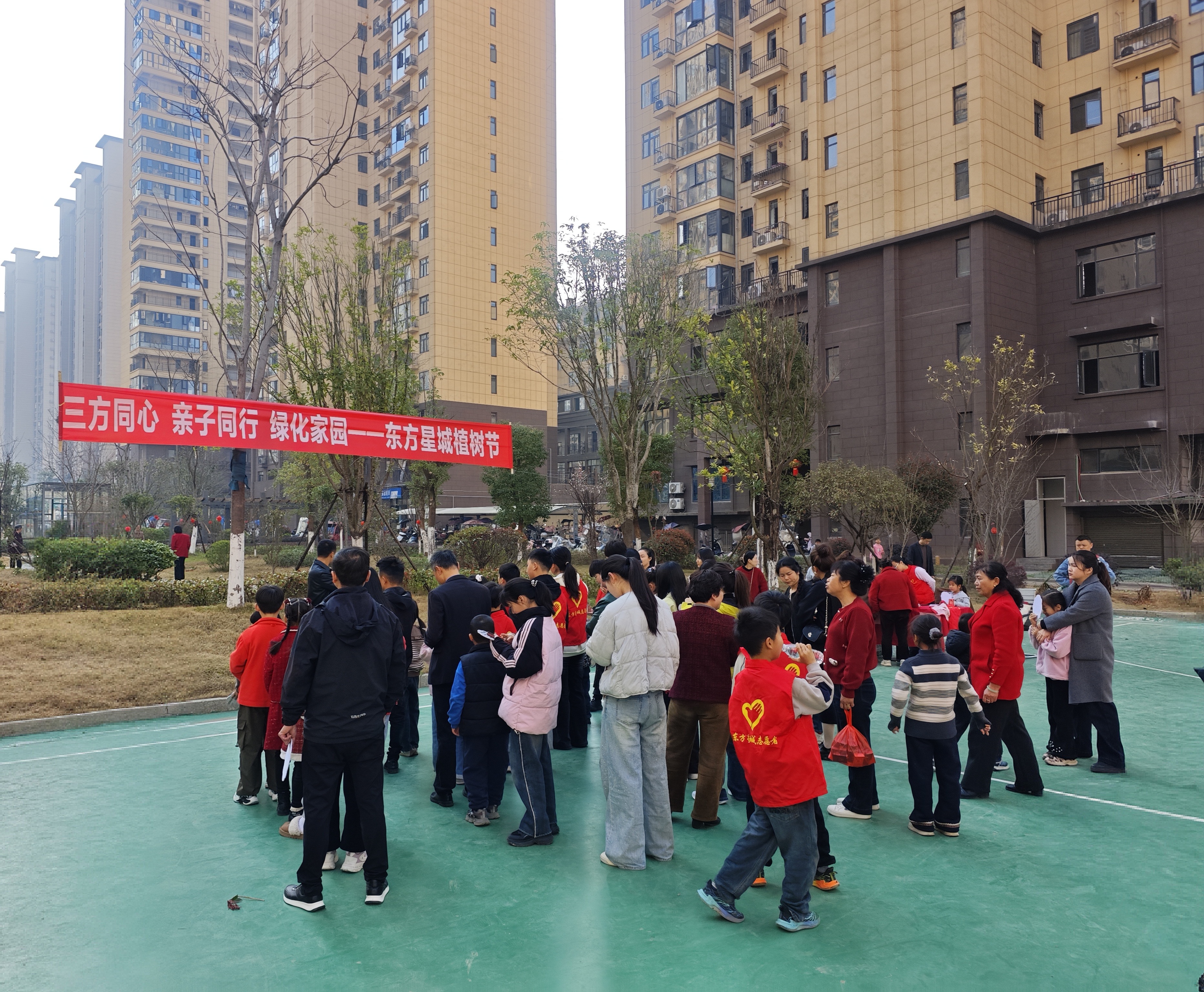 东方星城主会场秩序井然、暖意融融,处处涌动植树护绿热潮。挖掘机有序开展土地平整、树坑开挖,为绿植栽种筑牢基础;社区工作者、物业人员、居民代表、亲子家庭分工协作,新时代文明实践志愿者、红十字会志愿者全程参与、贴心护航。大家扶苗、培土、浇水、压实,有的手持铁锹仔细培土,有的提着水桶细心浇灌,每一个环节都细致严谨。亲子家庭携手栽下希望之树,还为认养的树木挂上专属认养牌,在躬身劳作中传递绿色理念、拉近邻里情谊;志愿者们做好安全保障与便民服务,用温情彰显责任担当;物业企业主动调配人力设备,全力投身绿化施工,以实际行动践行服务宗旨。暖阳之下,桂花、红叶石楠、红花檵木、南天竹、藤蔓月季等苗木扎根沃土,为小区披上清新雅致的春日绿装,氤氲出浓厚生机与暖意。