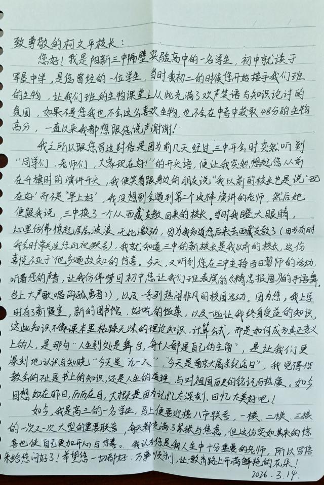 一句熟悉的问候,牵出一段跨越时光的师生情谊。一封真挚的匿名信,见证了一位教育工作者在学生心中留下的深刻印记。2026年3月14日,阳新三中党委书记柯文平收到了一封来自阳新实验高中高三学生的匿名感谢信。一句“同学们,老师们,大家现在好!”的独特问候,让她惊喜地发现,在阳新三中演讲的正是自己当年最敬重的老师,这名学生深情回忆了初中时在军垦中学求学的点滴。