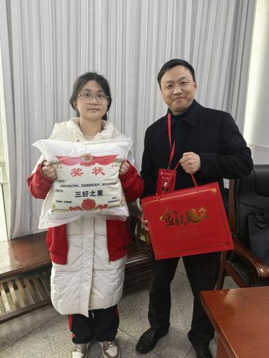 收到来信后,阳新三中党委书记柯文平深受触动。经多方了解核实,他确认写信人为阳新实验高中高三(8)班的郭晴晴同学。3月17日,他专程前往阳新实验高中看望郭晴晴同学。并为这位正在紧张备战高考的学子送上了精心准备的礼物——印有“三好之星”的抱枕和“金榜题名”礼盒,以此表达对昔日学生的关心与鼓励。同时勉励郭晴晴在高考冲刺阶段调整心态、稳扎稳打,将三年的积累化作笔下的力量,以从容自信的姿态迎接人生中的重要考验。