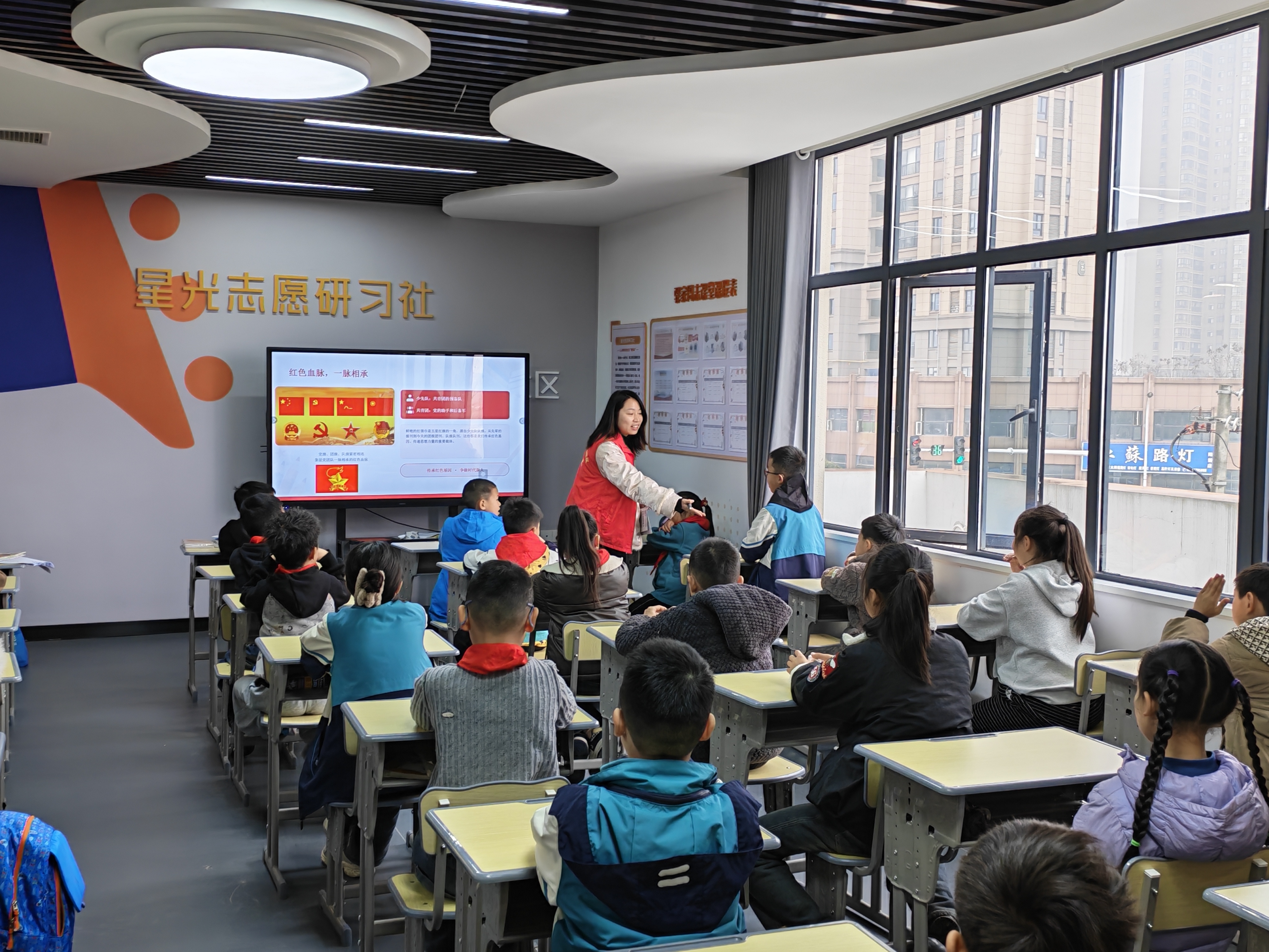 安全科普课落下帷幕,红色读书分享会接续开启。小鹿老师通过PPT讲解与互动游戏相结合的方式,带领孩子们开启了一场红色初心之旅。从党、团、队一脉相承的血脉联系,到红领巾的光荣由来与动人故事,再到阅读红色报刊、学习党史国史的重要意义,老师用鲜活的故事、生动的讲解,让红色历史变得可感可知,让孩子们读懂了红色基因的传承密码。 “红领巾为什么是三角形的?它承载着什么样的意义?”互动环节里,孩子们围绕红色主题争相提问、大胆分享,在一问一答中深化对红色精神的理解。在随后的红色主题手抄报创作环节,更是将现场氛围推向了高潮。在志愿者们的指导下,孩子们拿起彩笔和纸张,化身“小小创作者”,把课堂上学到的红色故事、爱国情怀融入笔尖。有的孩子画出飘扬的五星红旗与鲜艳的红领巾,有的写下“请党放心 强国有我”的铿锵誓言,还有的用剪贴画再现革命先烈的英雄形象。