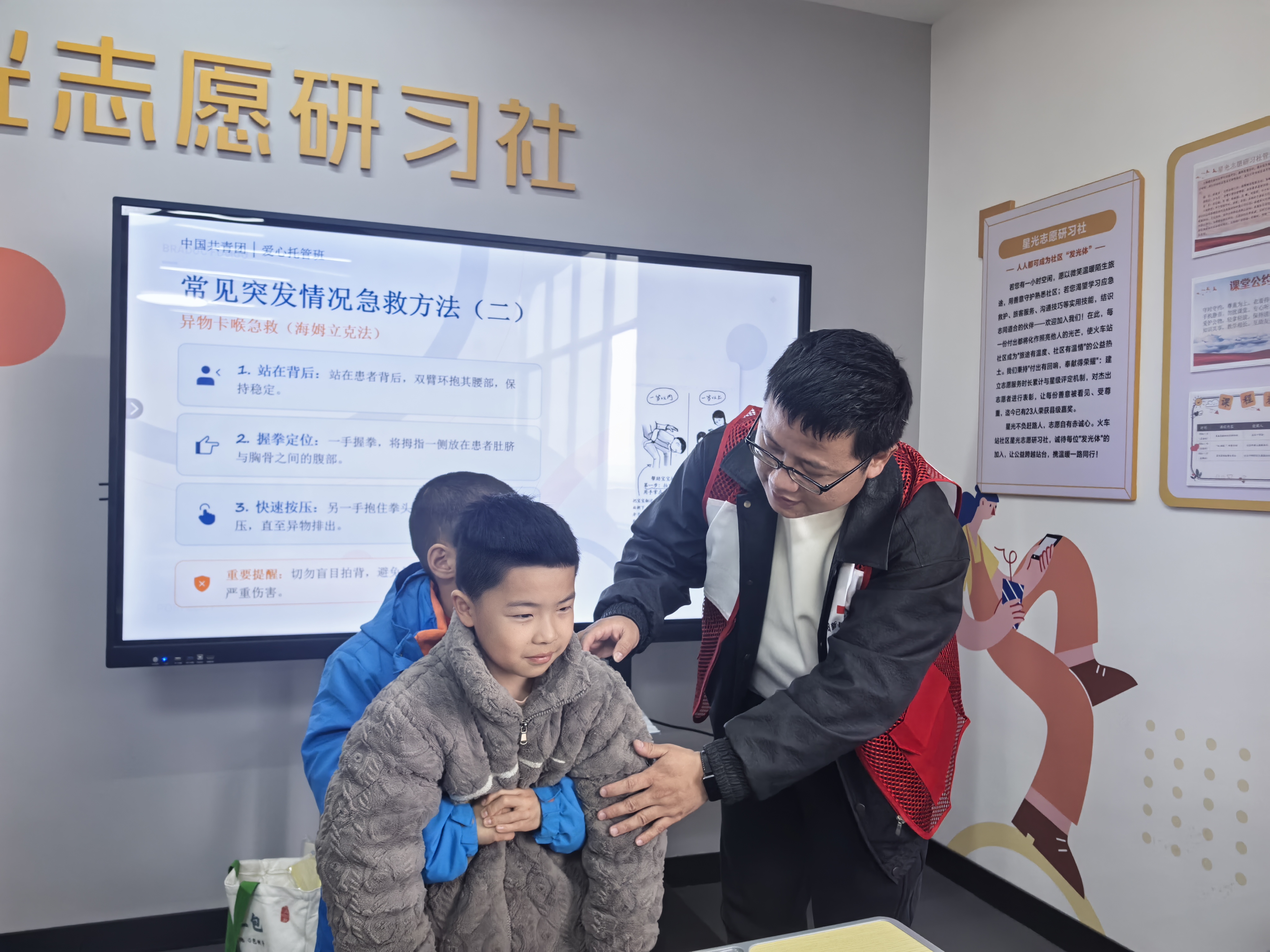 “如果身边的小伙伴不小心被异物卡喉,我们该怎么做?”面对志愿者的提问,孩子们纷纷举起小手踊跃作答,现场气氛瞬间被点燃。随后,志愿者手把手指导孩子们模拟练习海姆立克急救法,从站位、手势到发力技巧,一一纠正、耐心讲解,让孩子们在沉浸式实操中掌握自救互救技能,把安全意识的种子深深扎根于童心深处。