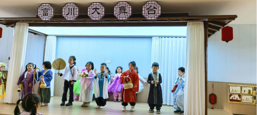 在表演馆,“富川大舞台”上好戏正酣。孩子们自主化妆,粉墨登场,生动演绎传统采茶戏《八仙过海》的经典桥段。一招一式虽显稚嫩,却透着对传统文化的深深眷恋。