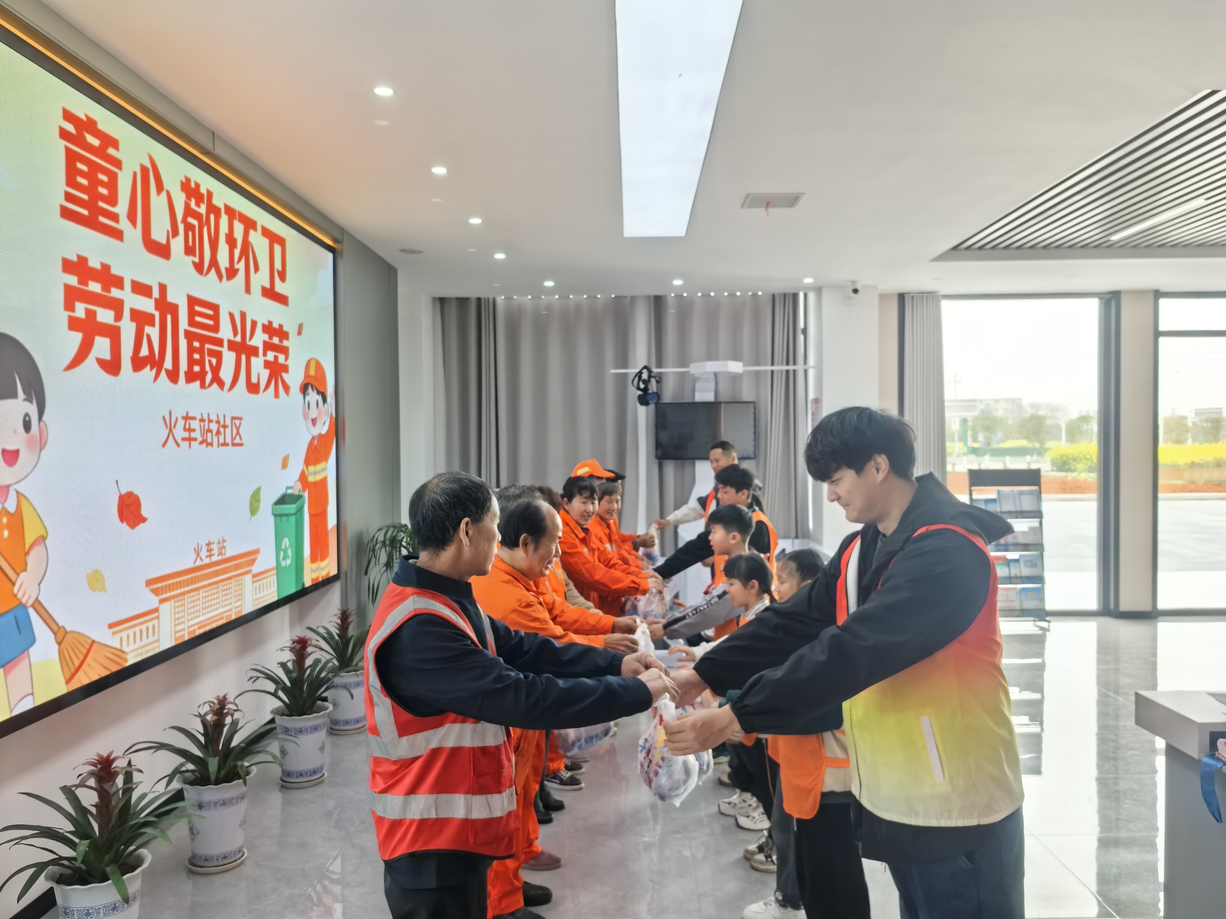 一小时的实地劳作结束后,孩子们围坐在一起交流心得。“我才扫了十几分钟就腰酸背痛,以后再也不乱扔垃圾了,要好好爱护环境。”“环卫工人不管刮风下雨都要上班,他们是城市里最辛苦的人……”童言童语里,满是对环卫工作的理解与对劳动者的真诚敬意。随后的致敬环节,社区工作人员现场致辞,向全体一线环卫工人致以诚挚问候。在党员志愿者的带领下,孩子们手捧爱心水杯、防护手套等暖心物资,送到环卫工人代表手中,用稚嫩的声音齐声说道:“叔叔阿姨,你们辛苦了!”接过礼物,环卫工人脸上露出欣慰的笑容,现场暖意融融,互动氛围拉满。