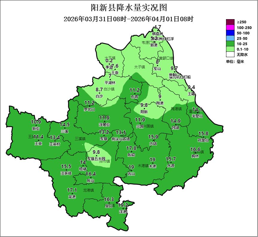 一、天气实况 3月31日8时~4月1日8时,我县小雨到中雨转多云。降雨量7~19.2毫米,其中阳新国家站降雨量9.8毫米,城区11.9毫米,最大降雨量19.2毫米出现在洋港。最高气温13.3~17.8℃,最低气温8.6~12.5℃。 二、未来天气预报 4月1日:晴到多云,早晨局部有雾,偏东风2~3级,气温12~23℃。 4月2日:阵雨转小雨到中雨,西北风2~3级,气温14~20℃。 4月3日:小雨转多云,偏东风2~3级,气温14~19℃。 发布:胡凌露
