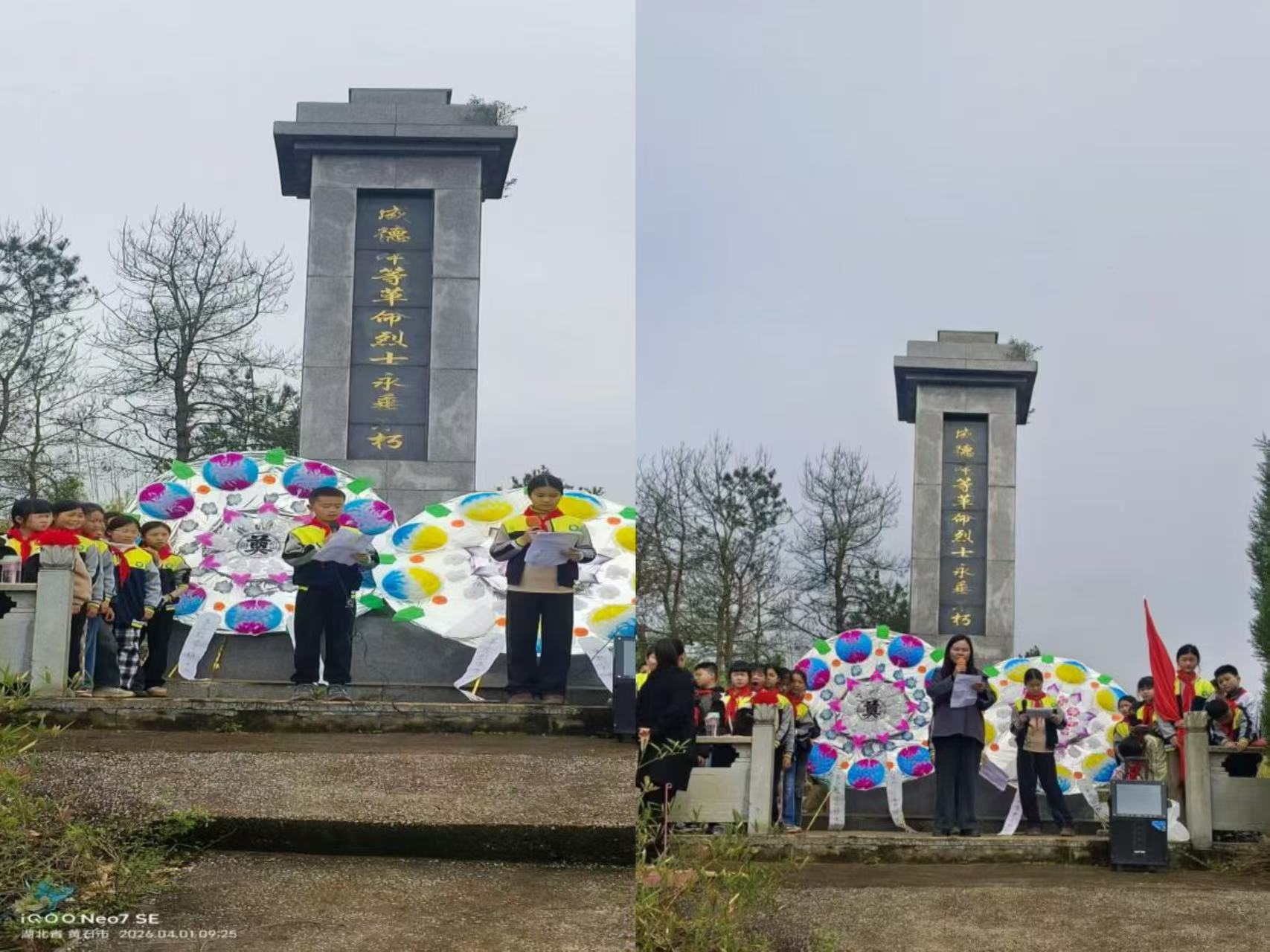 抵达烈士纪念碑前,全体师生整齐列队、神情肃穆。伴随着庄严的仪式,全体师生默哀三分钟,在静默中追思先烈的英勇事迹。 默哀毕,师生代表依次发言。学生代表成金锐用稚嫩却坚定的声音,讲述着对先烈的敬仰与传承红色精神的决心;教师代表张环姣勉励学生们铭记历史、珍惜当下。随后,全体少先队员面向纪念碑庄严宣誓,铿锵有力的誓言回荡在陵园上空,彰显着黄桥小学学子传承红色基因、立志报效祖国的坚定信念。