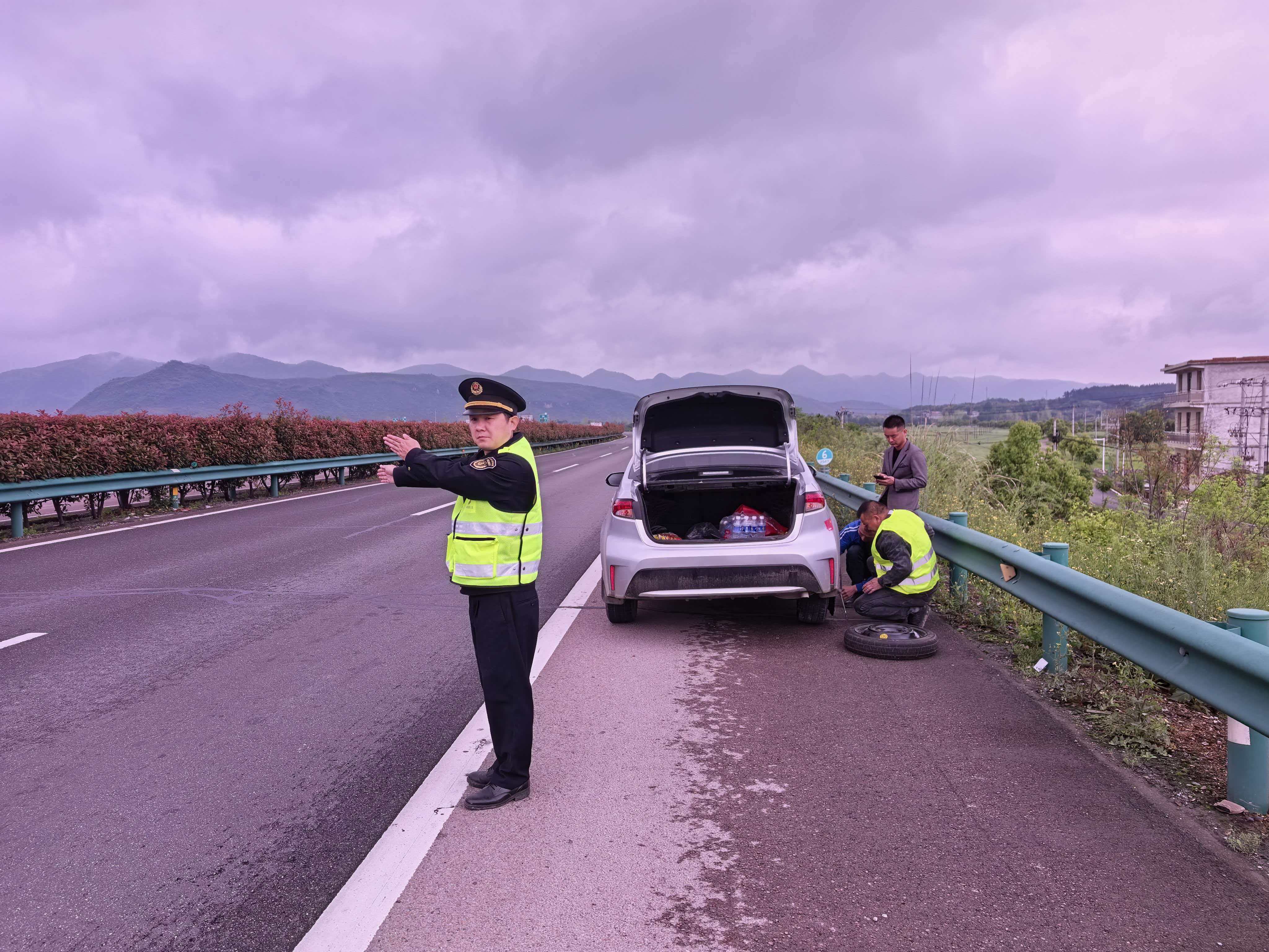 4月14日,湖北省交通运输综合行政执法总队高速公路路政执法二支队七大队路政执法员李佑虎、张恒在大广南高速阳新段辖区路段常态化巡查,途经广大向K2547+600位置时,发现一辆车因轮胎故障滞留应急车道。车辆警示防护措施不足,过往车流密集,极易引发交通事故,安全隐患突出。