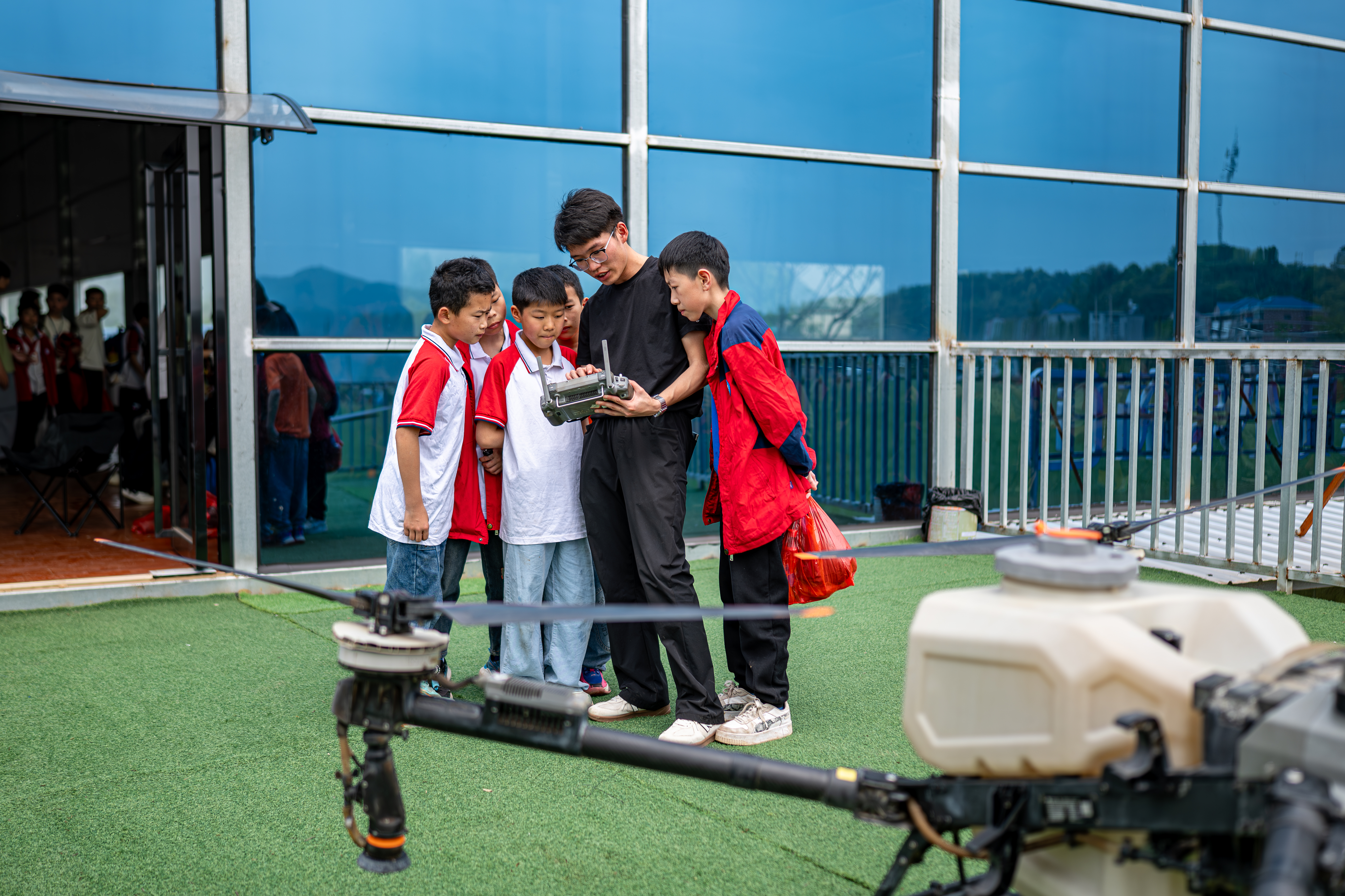 最受学生欢迎的是农业无人机实践环节。专业飞手现场演示了农业无人机的操作流程。随着一阵低沉的嗡鸣声,无人机腾空而起,在农田上空灵活穿梭,现场欢呼声此起彼伏。不少学生上前尝试操作,直观感受到“科技+农业”的广阔前景,改变了对传统农业的刻板印象。