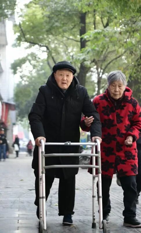 张富清老英雄左腿截肢后,孙玉兰搀扶着老伴出门买菜。(资料图,唐俊 摄)
