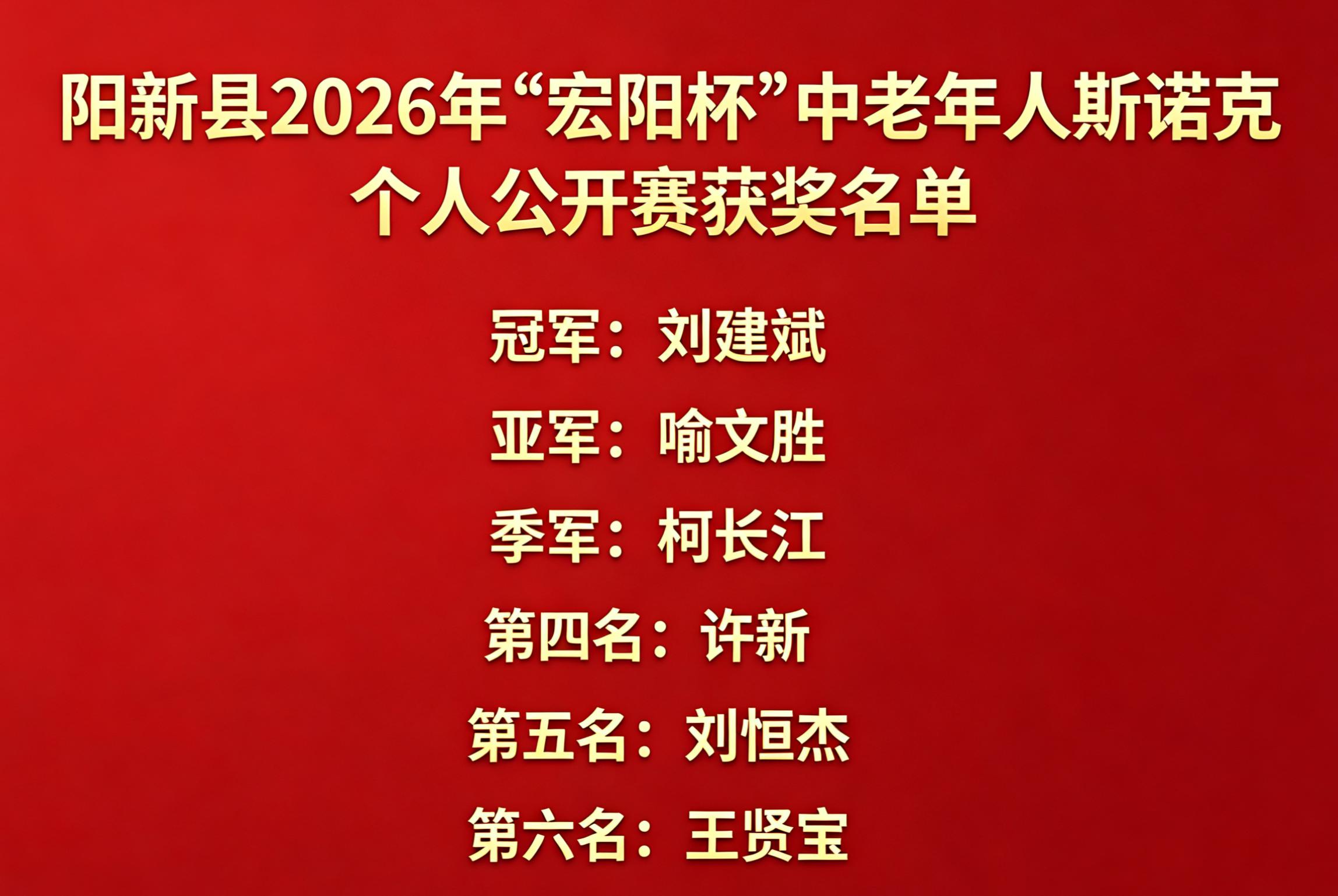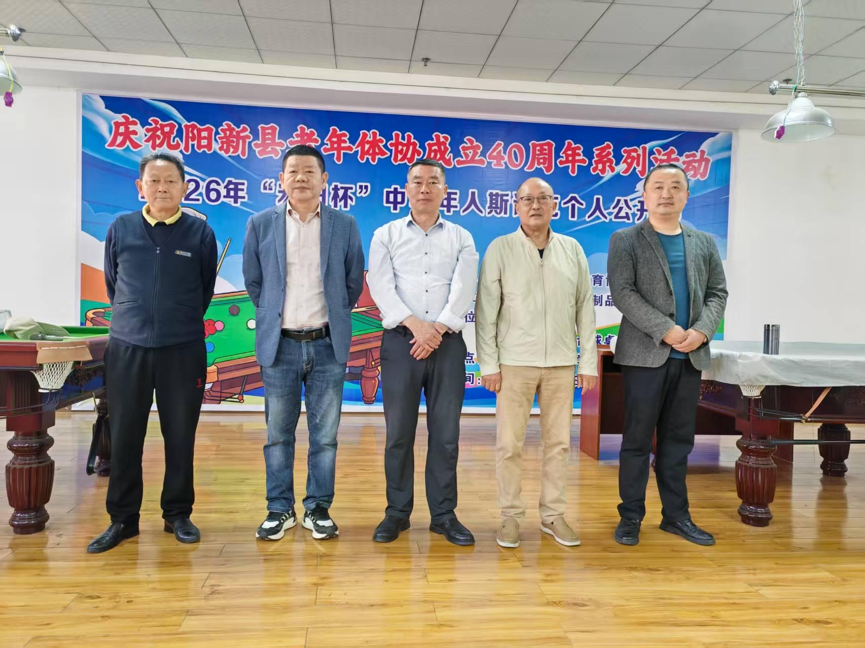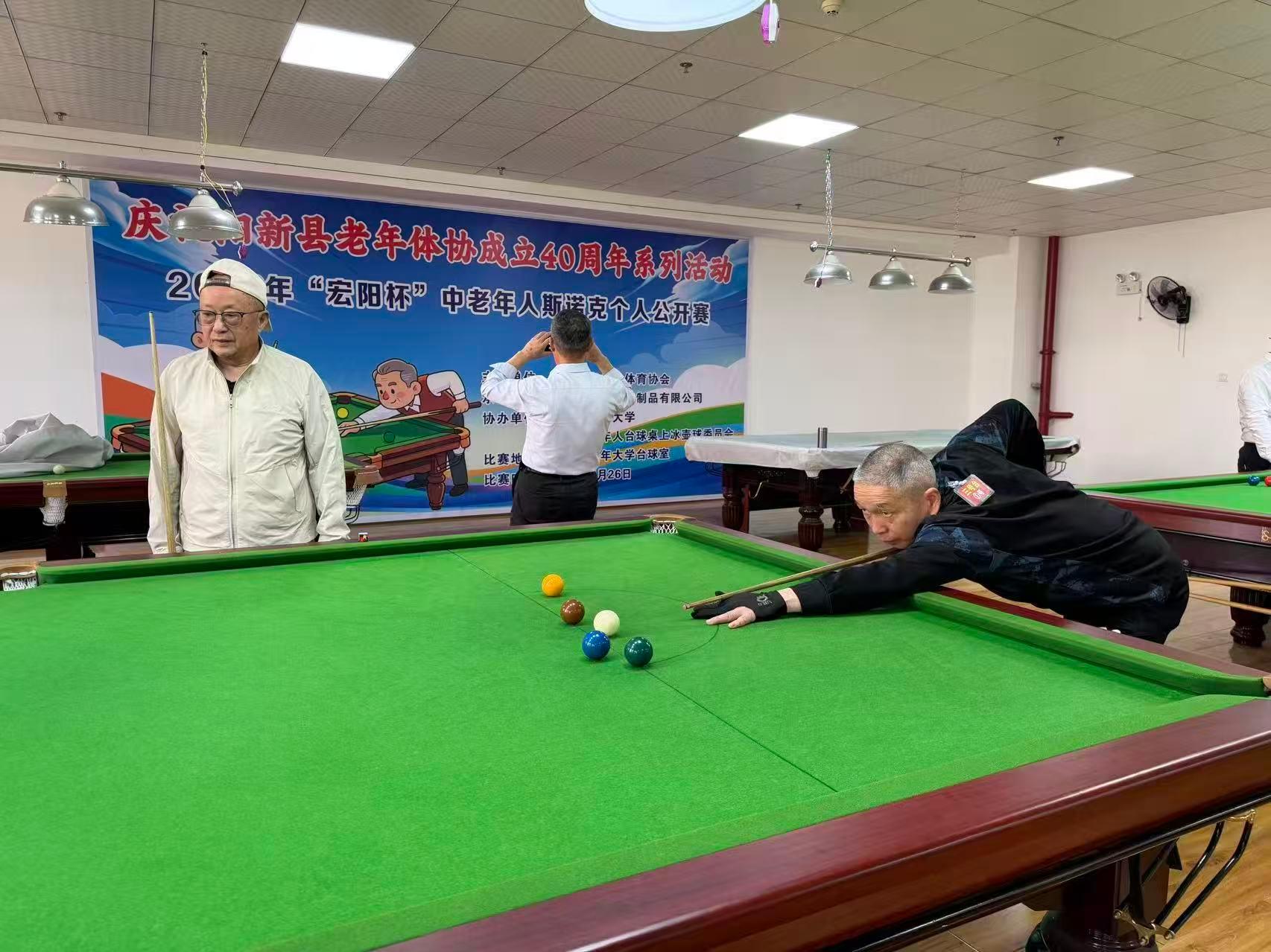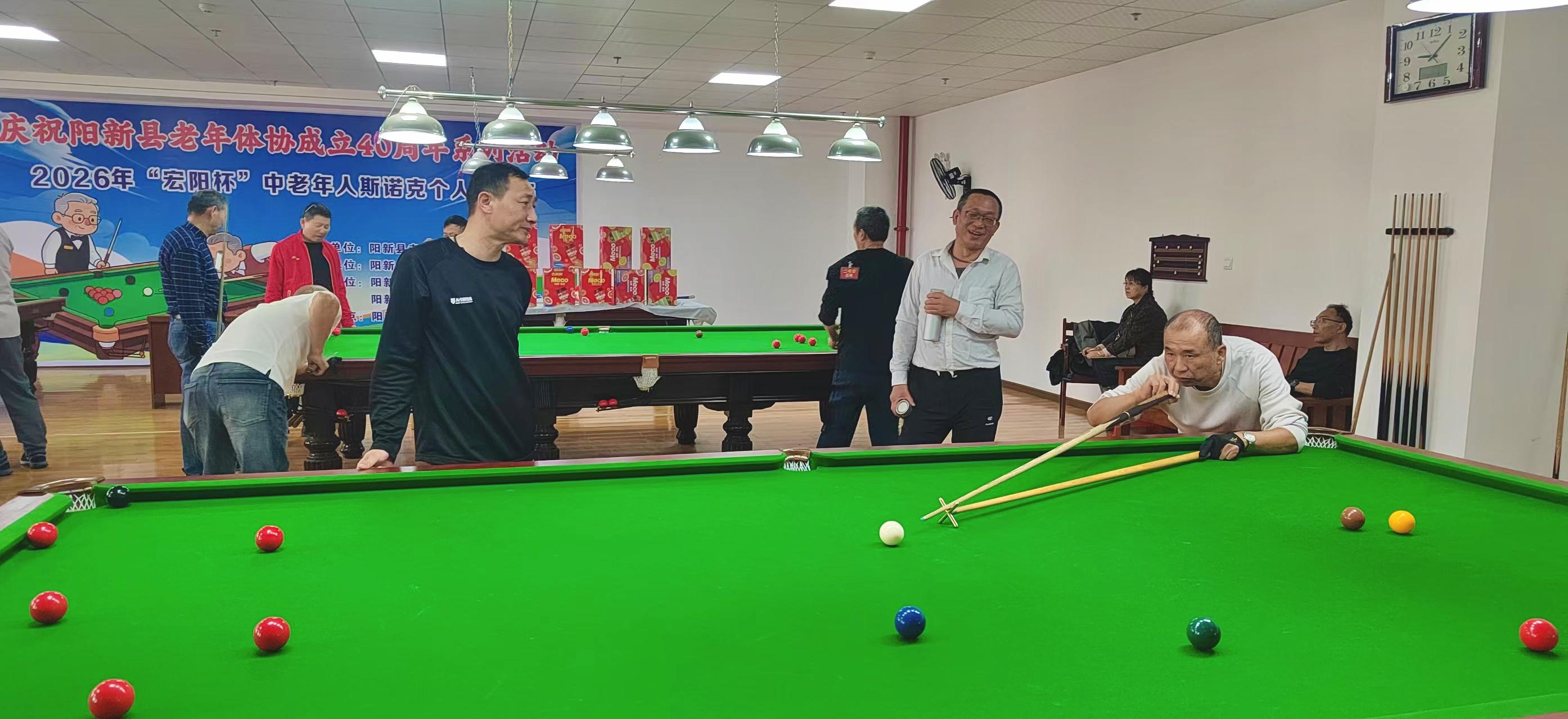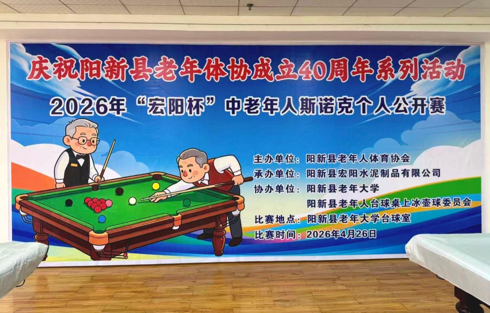 为庆祝阳新县老年人体育协会成立40周年,4月26日,阳新县2026年 “宏阳杯” 中老年人斯诺克个人公开赛在老年大学台球室顺利举行。本次比赛由阳新县老年体协主办,阳新县宏阳水泥制品有限公司承办,阳新县老年大学、阳新县老年体协台球桌上冰壶球委员会联合协办。