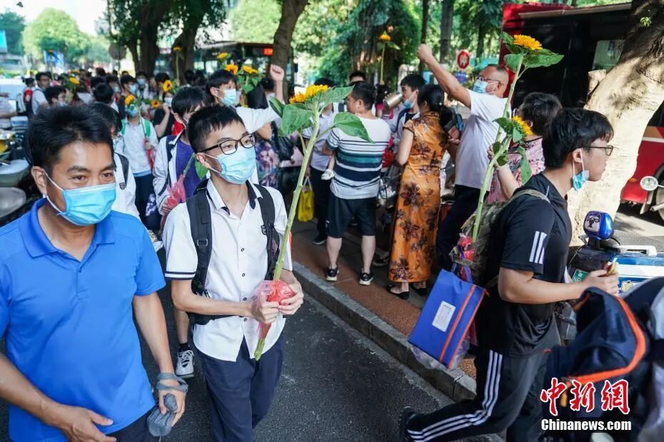 图为考生手持家长送来的葵花走进考场,葵花寓意“一举夺魁”。陈冠言 摄