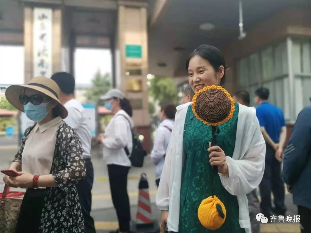 济南一中考点,有一家长拿着向日葵来送自己的孩子,寓意一举夺魁。