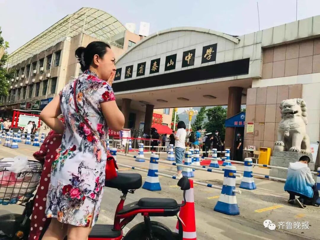 泰安市泰山中学考点外,不少考生家长身着旗袍给考生们助考,寓意“旗开得胜”。