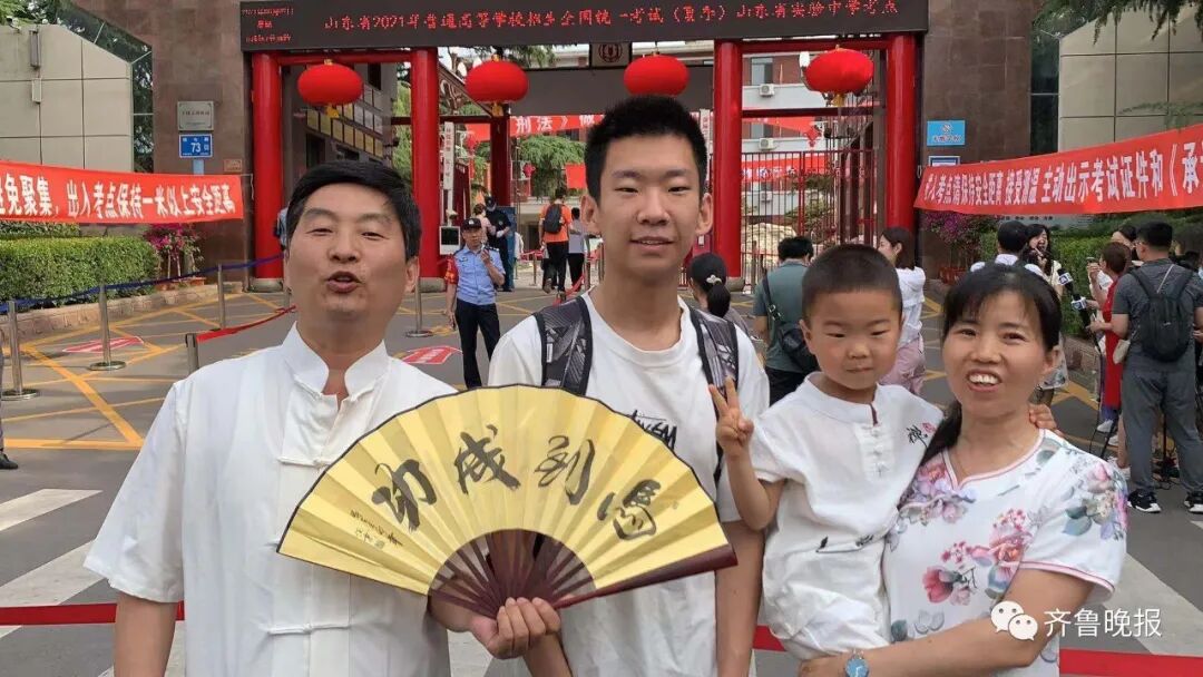 山东省实验中学考点外,四岁萌娃沫沫跟着爸爸妈妈组成亲友团来送考,为参加高考的哥哥加油打气。妈妈是旗袍,爸爸和沫沫则是传统的马褂,寓意祝福考生旗开得胜,马到成功。齐鲁晚报·齐鲁壹点记者 王媛