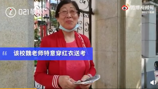 图为教师身穿大红衣服,为学子加油。叶茂 摄