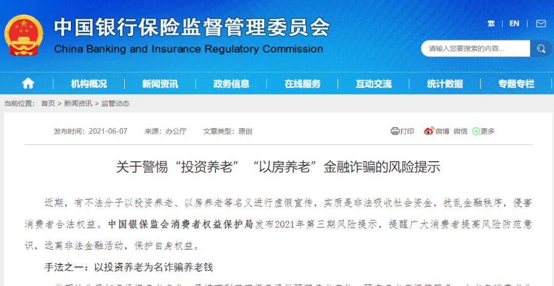 近期,有不法分子以投资养老、以房养老等名义进行虚假宣传,实质是非法吸收社会资金,扰乱金融秩序,侵害消费者合法权益。