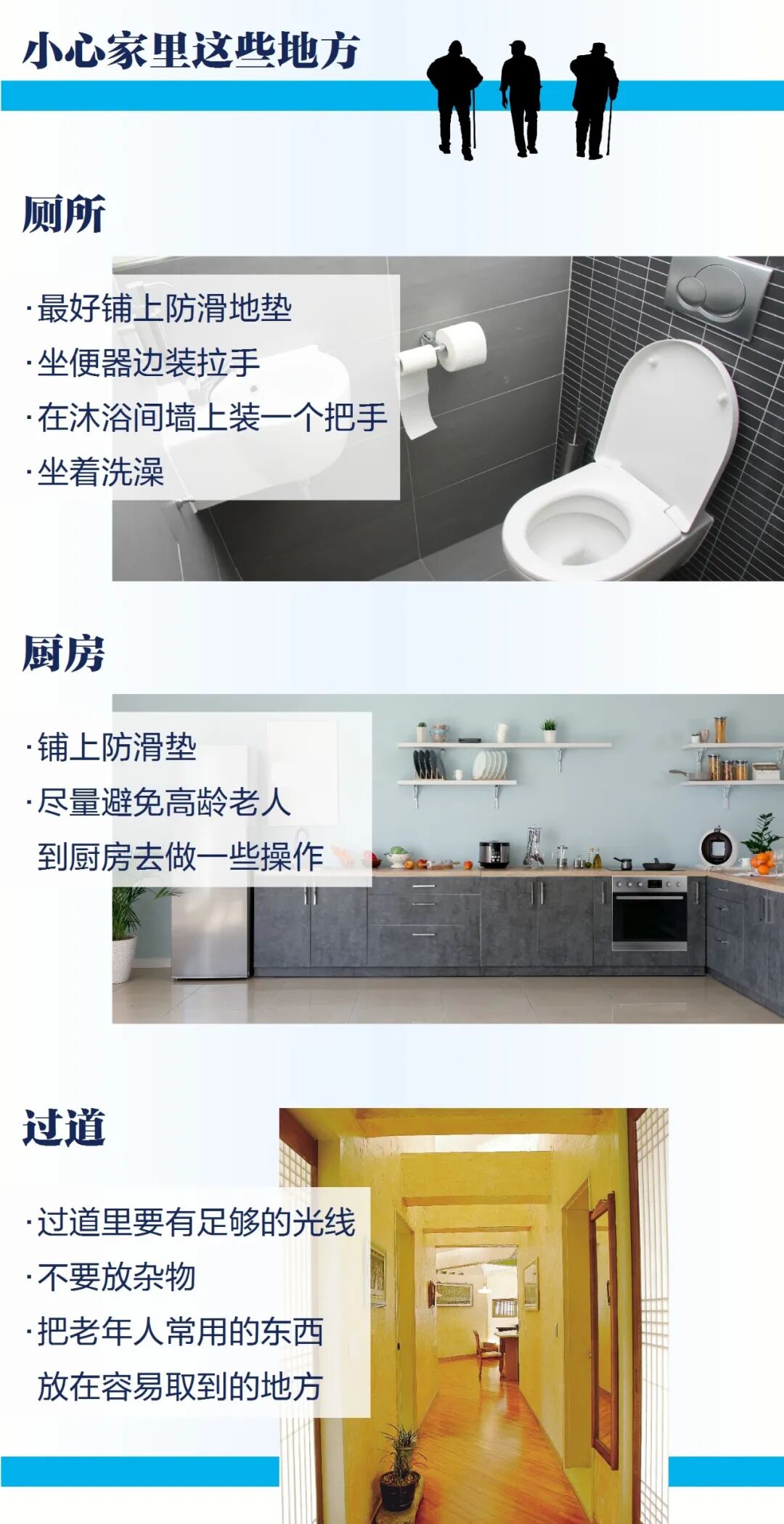 此外,老年人的步伐和抬腿的高度明显低于中青年人,穿拖鞋或鞋跟高于2.5厘米的鞋时,也容易滑跌倒。