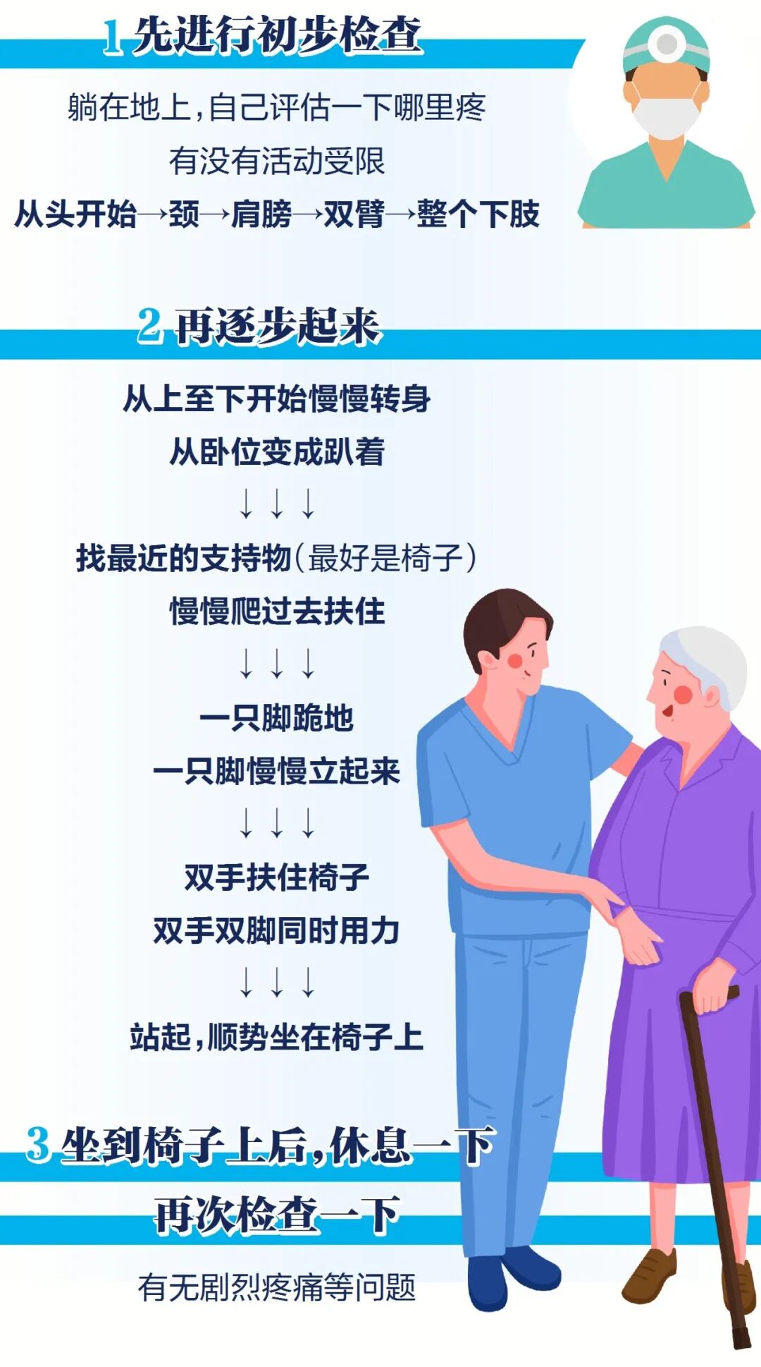 “老年人跌倒后,切记不要马上起来(或把他扶起来),要先评估一下,到底摔没摔伤。”李烨特别提醒,“在摔伤的情况下贸然起来,会产生附带损伤。”