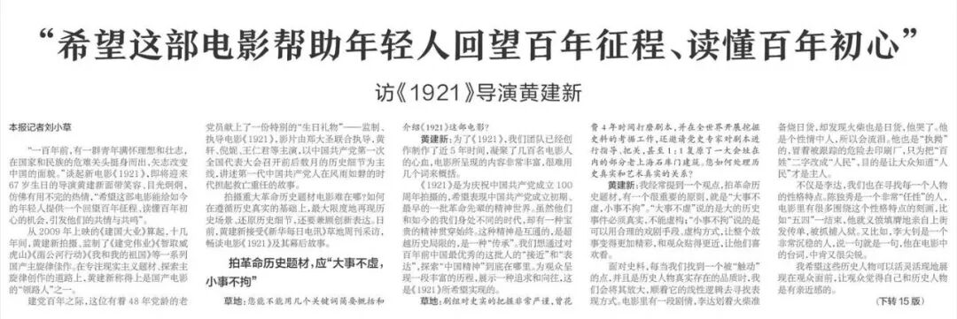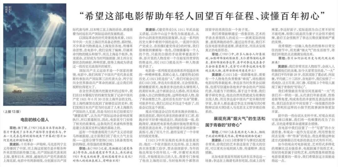 黄建新:《1921》故事情节与事实匹配度非常高,给我们的艺术表达留出了很大的空间,可以更充分地刻画人物、传递精神、表达感触。